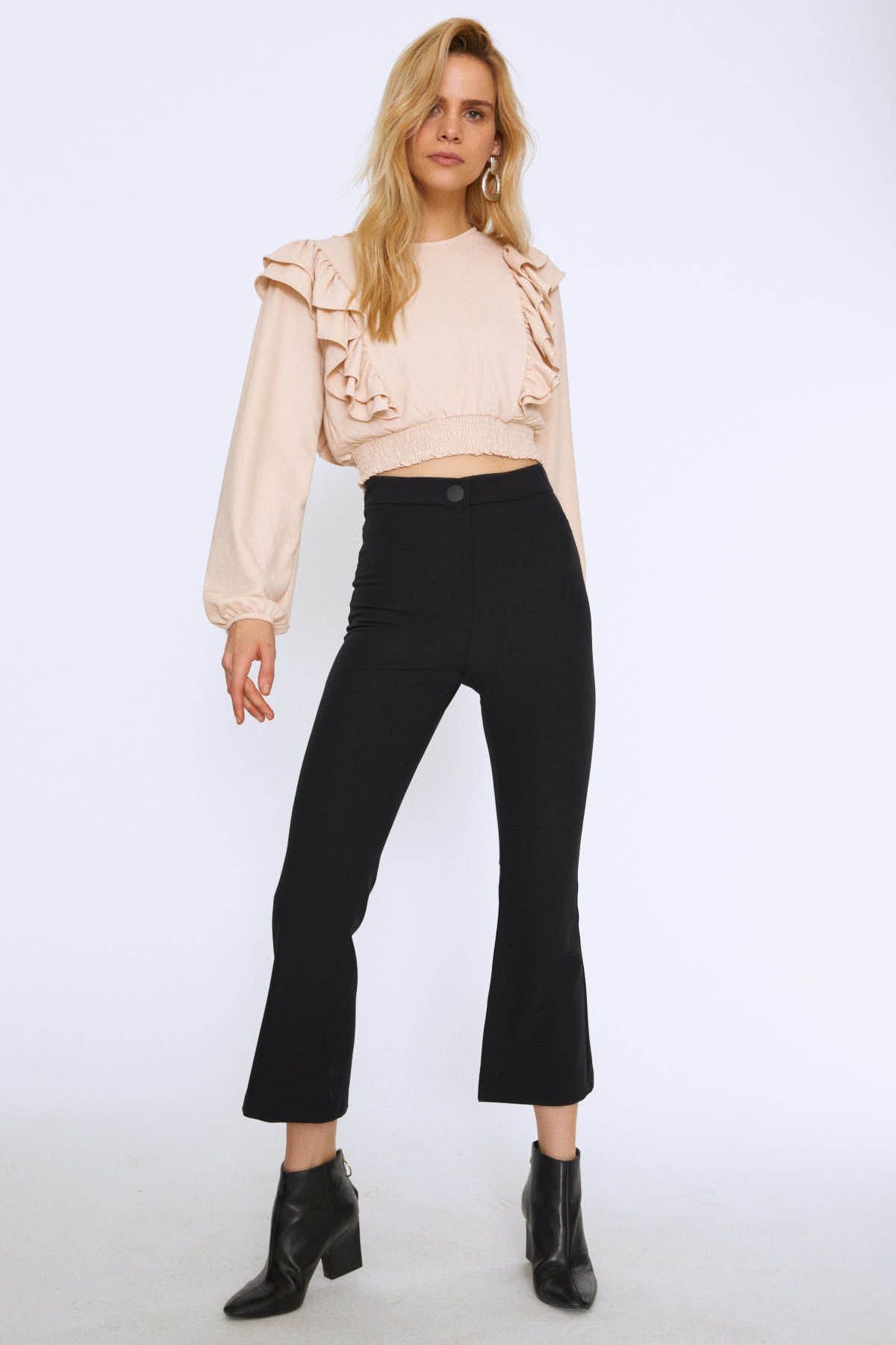 Kombinlendiğin her parçaya keyifli bir esinti kazandıran İspanyol paça pantolon, her dönemin trendi. Her mevsim rahatlıkla kullanabileceğin İspanyol paça pantolon, dolabında yerini almaya hazır.