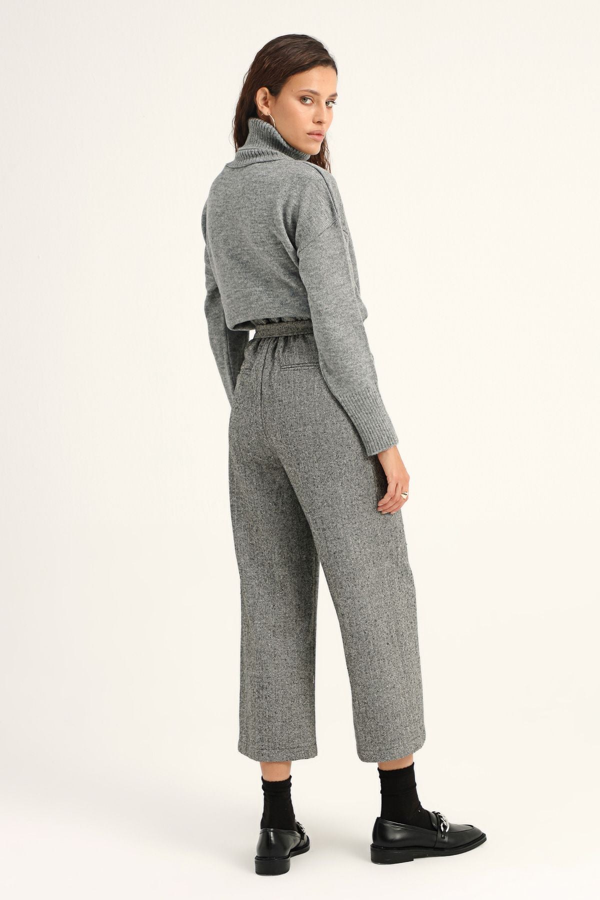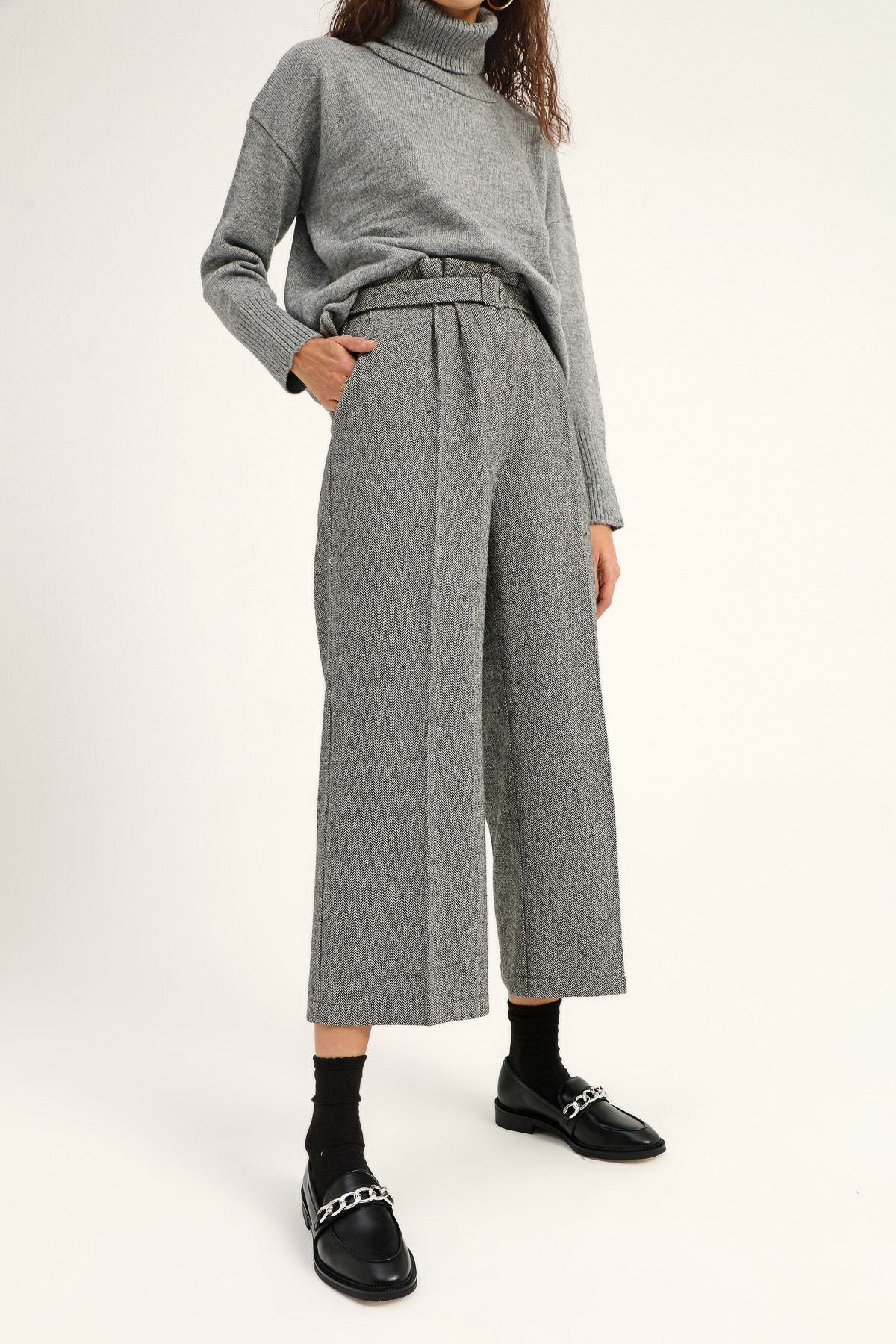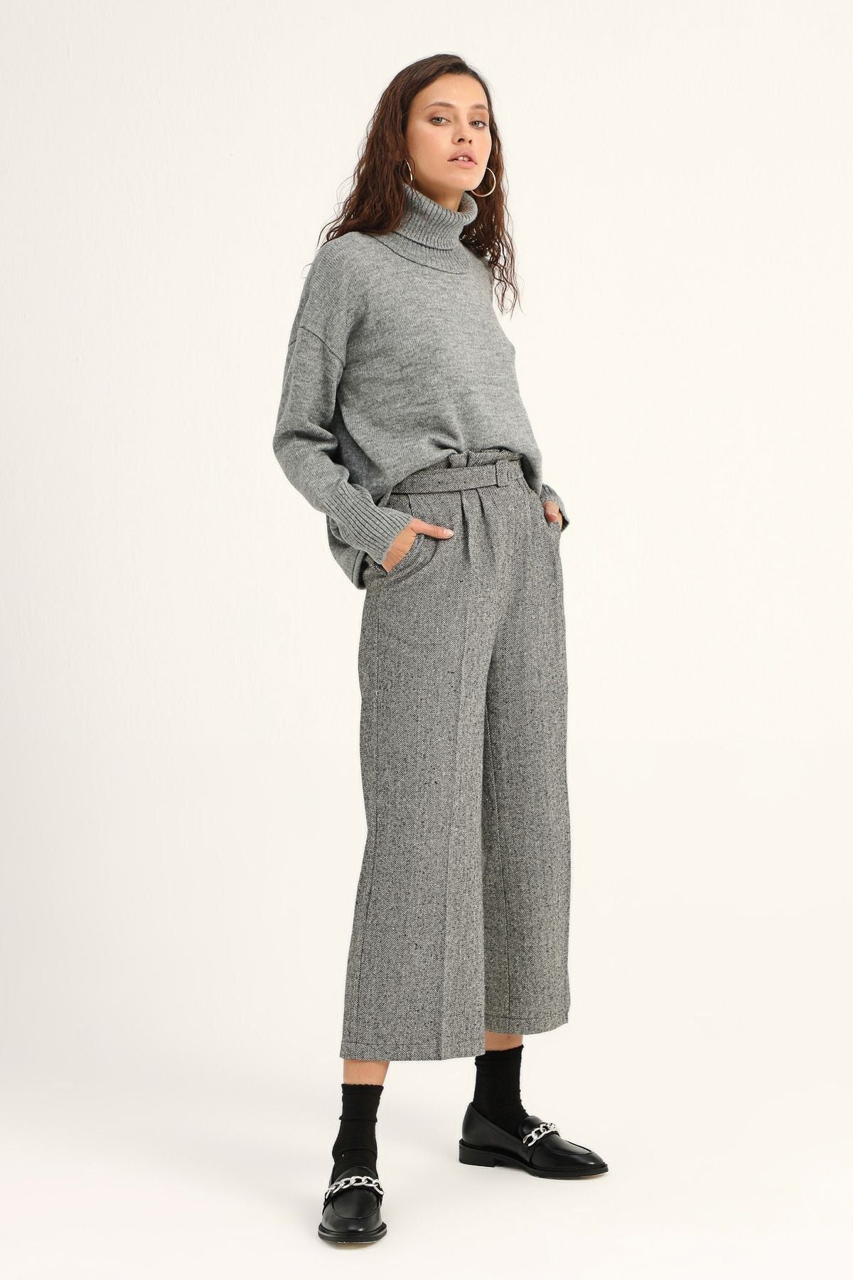 İş yerinin stil ikonu olarak gösterilmek için doğru parçaları birleştirmekte üstüne yok! Kemerli bol paça pantolon modeli ile tarzını konuştururken, basic triko parçalarla yapacağın kombinlerle yünlü pantolonun bel detayını ön plana çıkartabilirsin. Makosen ayakkabılarla çizginin dışına çıkabilir, bootie ya da çizmelerle gözünü yükseklere dikebilirsin!