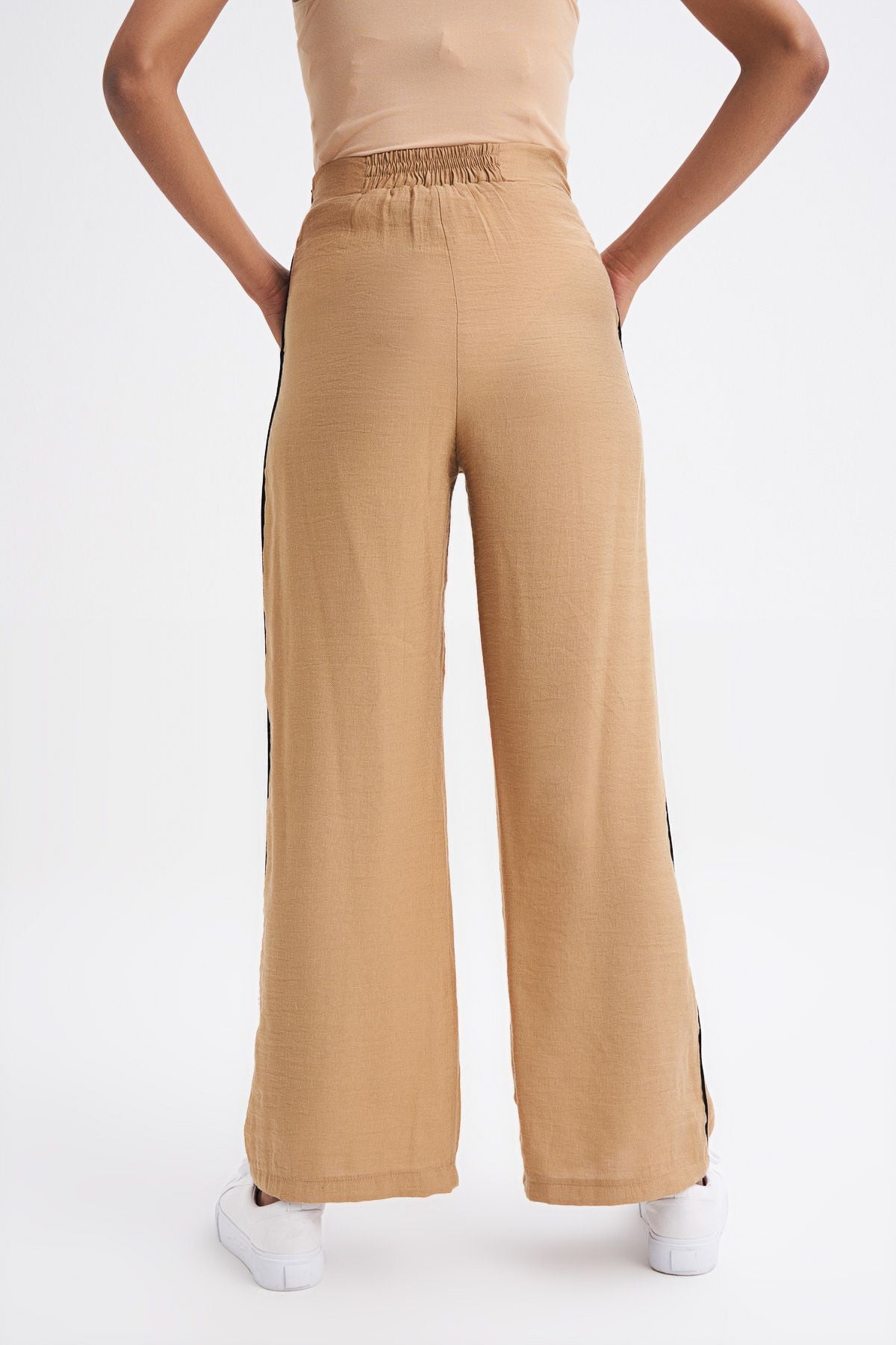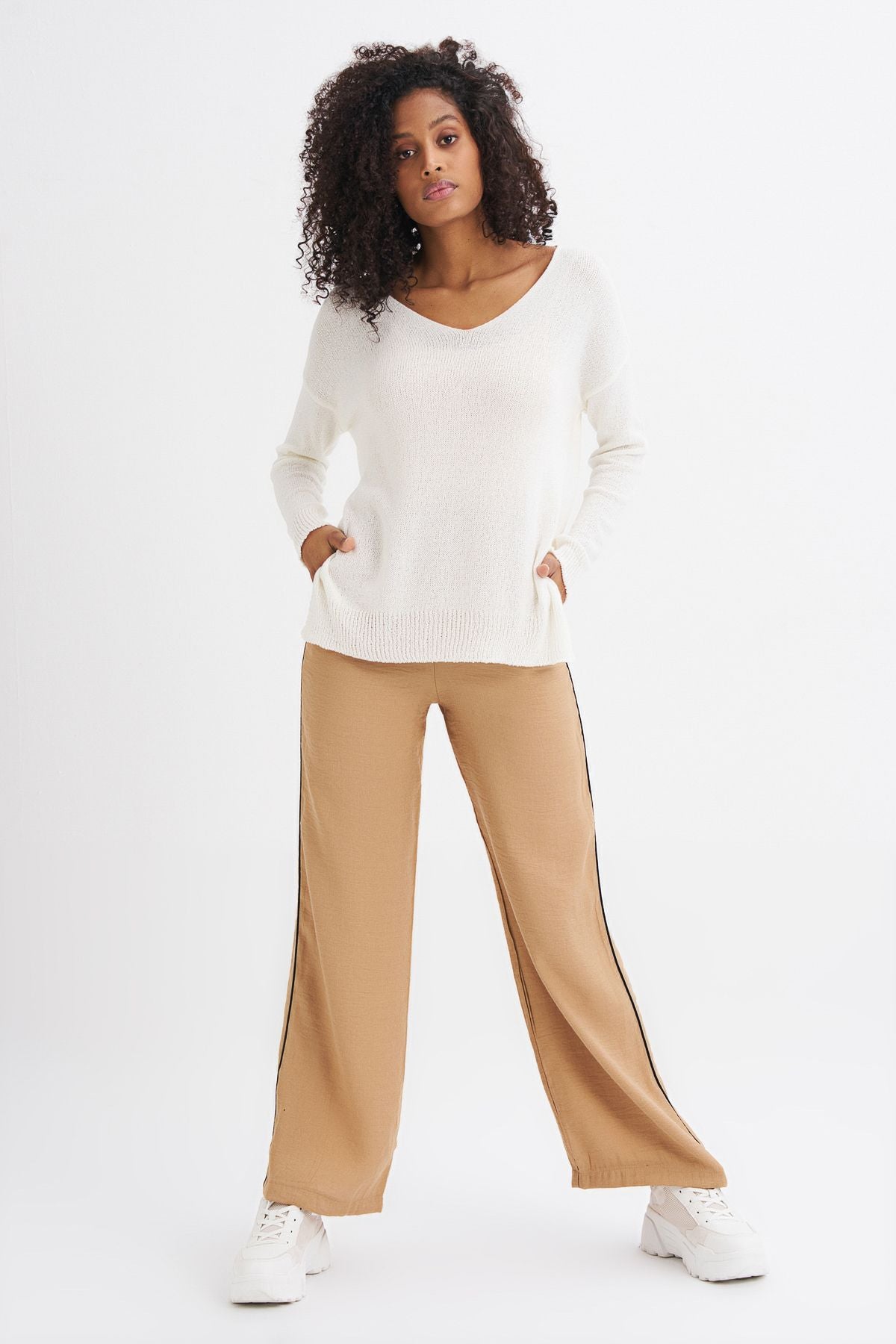 Göründüğünden bile rahat formu ve farklı renk çeşitleri ile şık şerit detaylı pantolon, Pazar kombinlerinin vazgeçilmezleri arasında yerini almaya hazır.