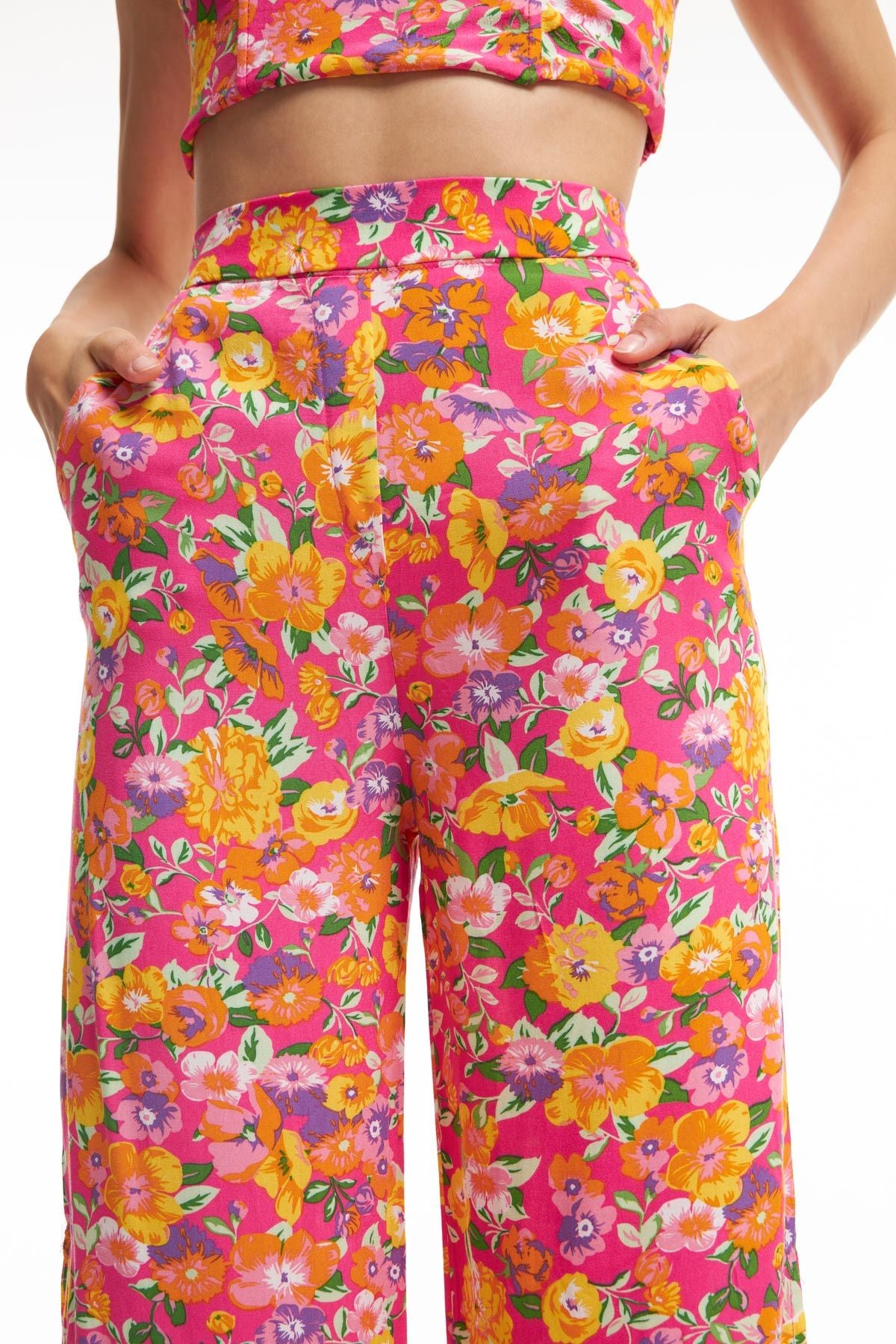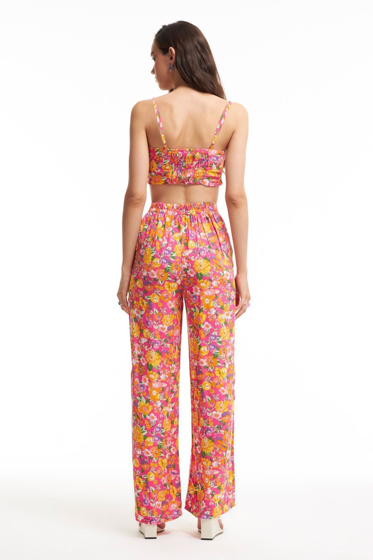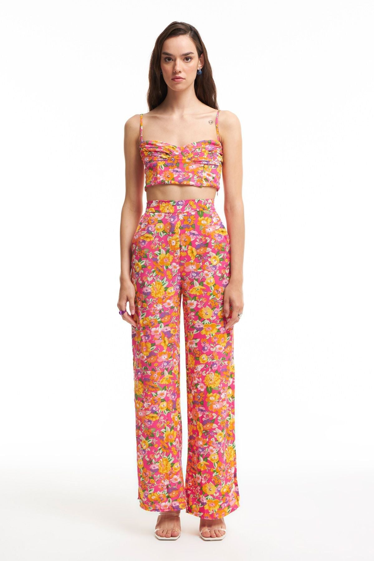 Yüksek bel, arka bel kısmı lastikli, cepli, yan paça boyları yırtmaçlı, takım bluz ürünü mevcut, çiçek desen, bol paça pantolon.