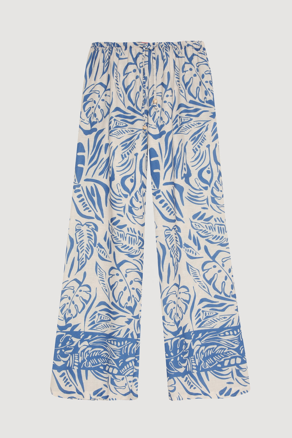 Renkli yaprak desenli, beli lastikli ve ahşap bağcık detaylı, rahat kalıp, uzun boy, çift cepli, bol paça pantolon.