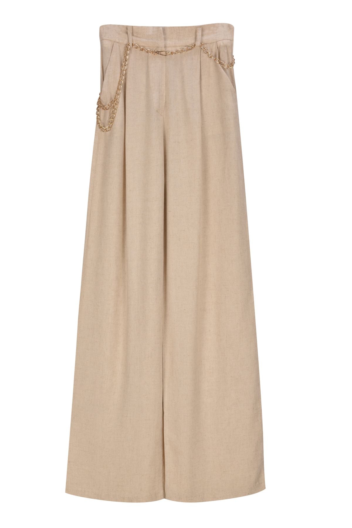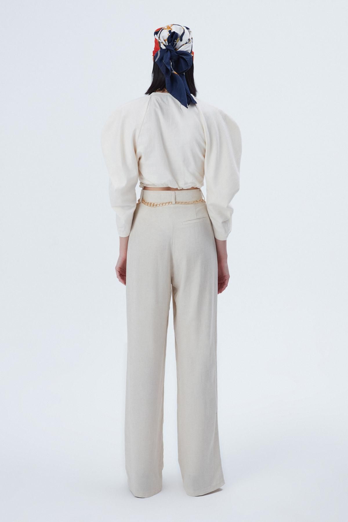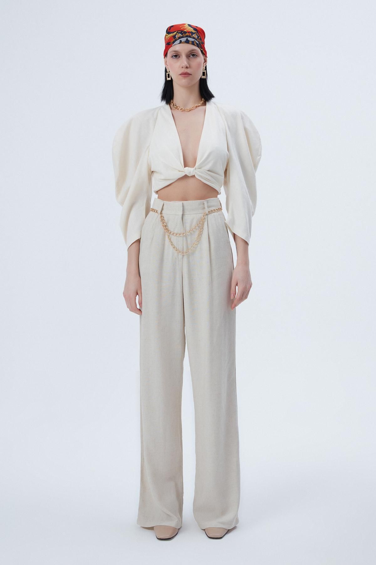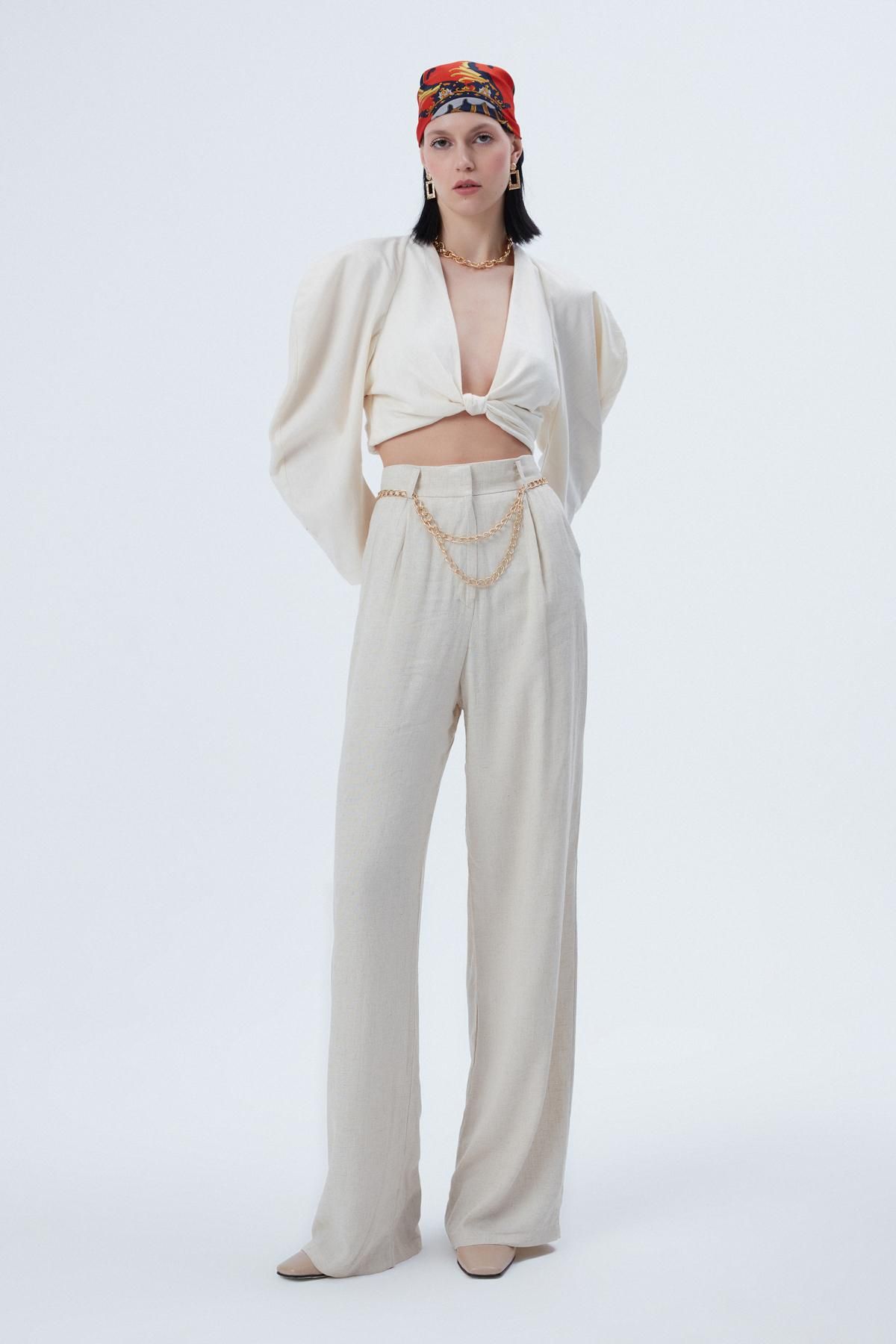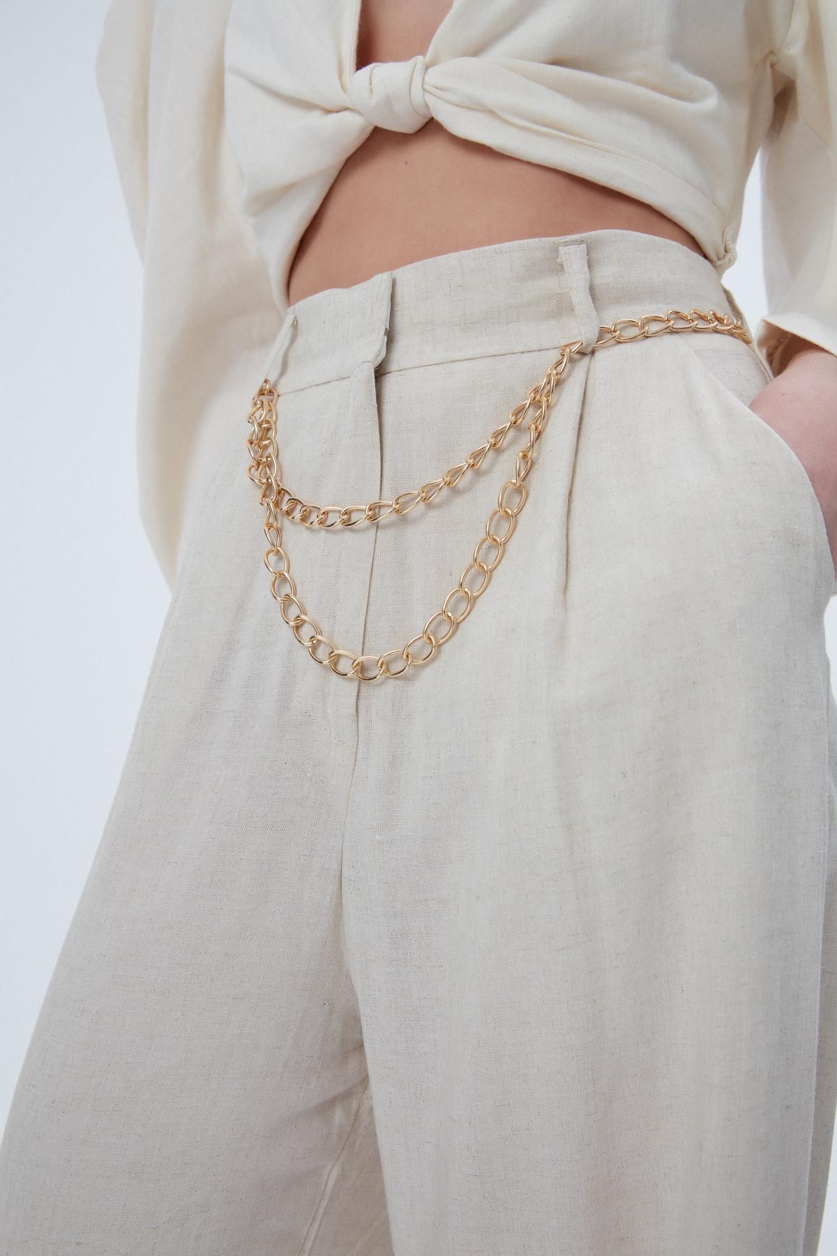 Zincir Kemerli Bol Paça Pantolon Naturel