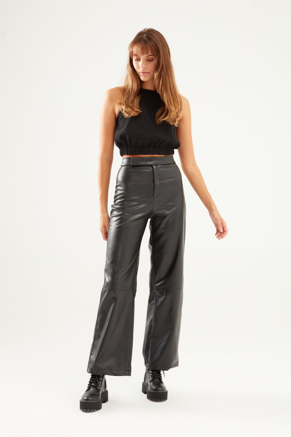 Geniş Paça Deri Pantolon Siyah