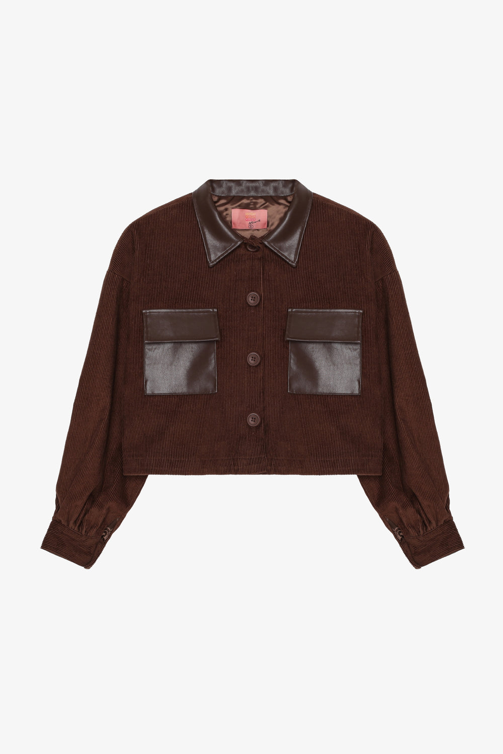 Kontrast Yaka Cepli Oversize Kadife Ceket Kahverengi