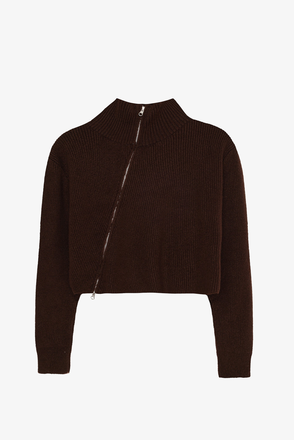 Asimetrik Fermuarlı Triko Kazak Kahverengi