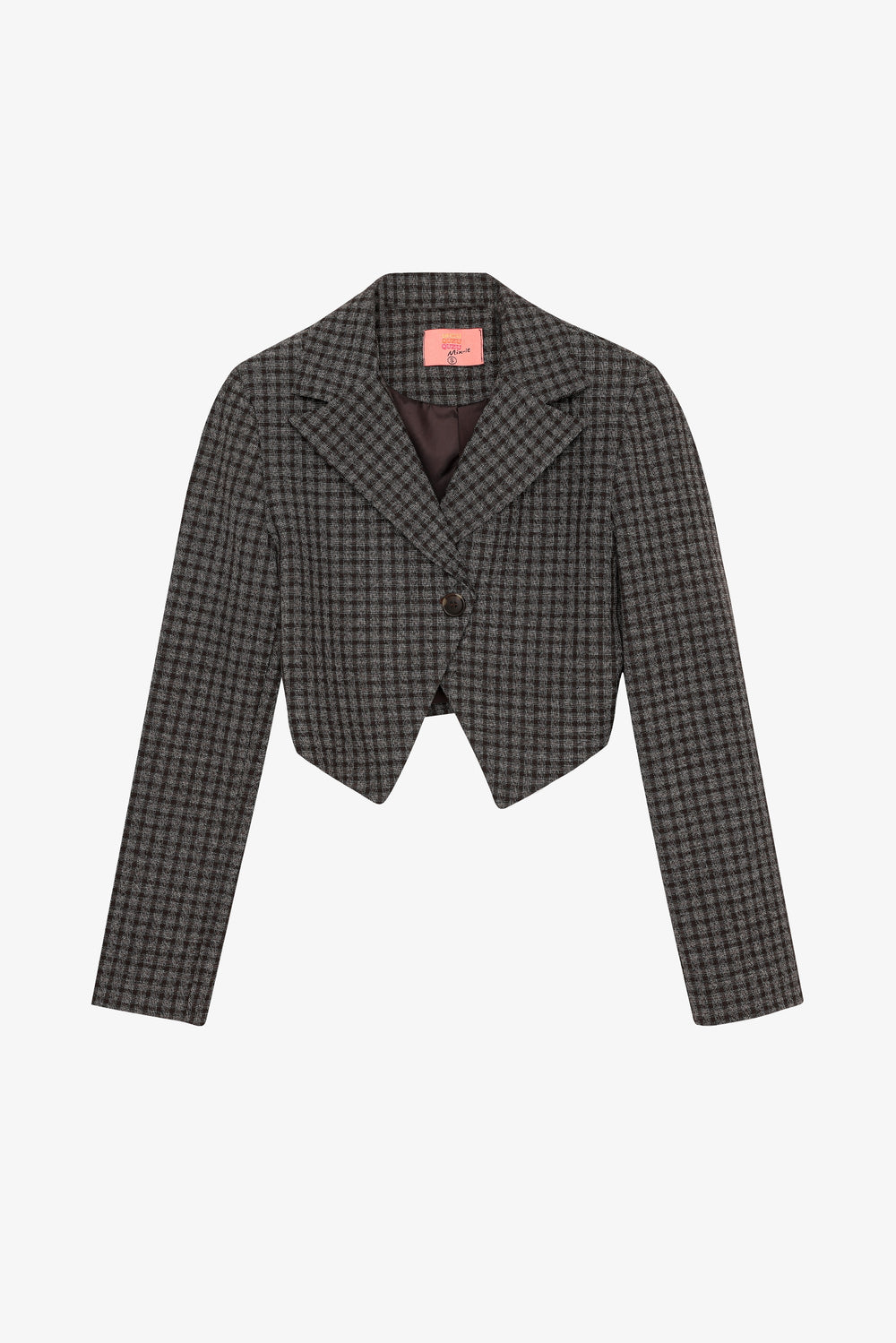 Ekose Tek Düğmeli Crop Blazer Ceket Kahverengi