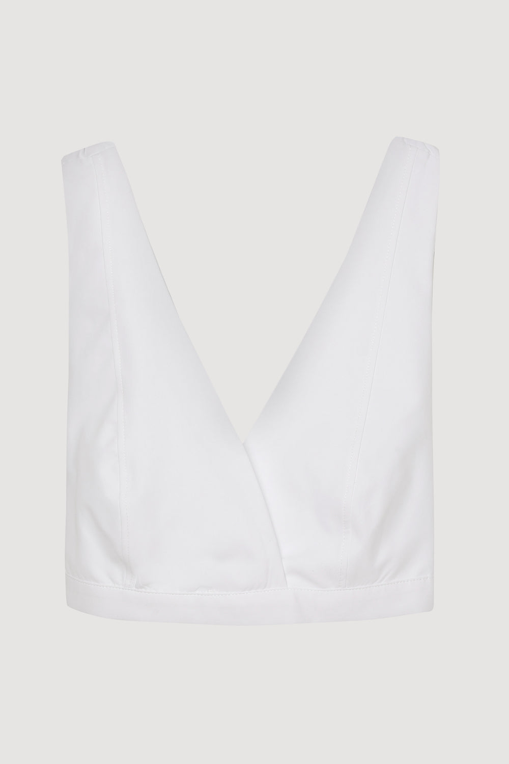 V yaka, kalın askılı bağlamalı, astarsız, önü kruvaze kesim detaylı, sırtı v yaka lastikli crop boy büstiyer bluz.