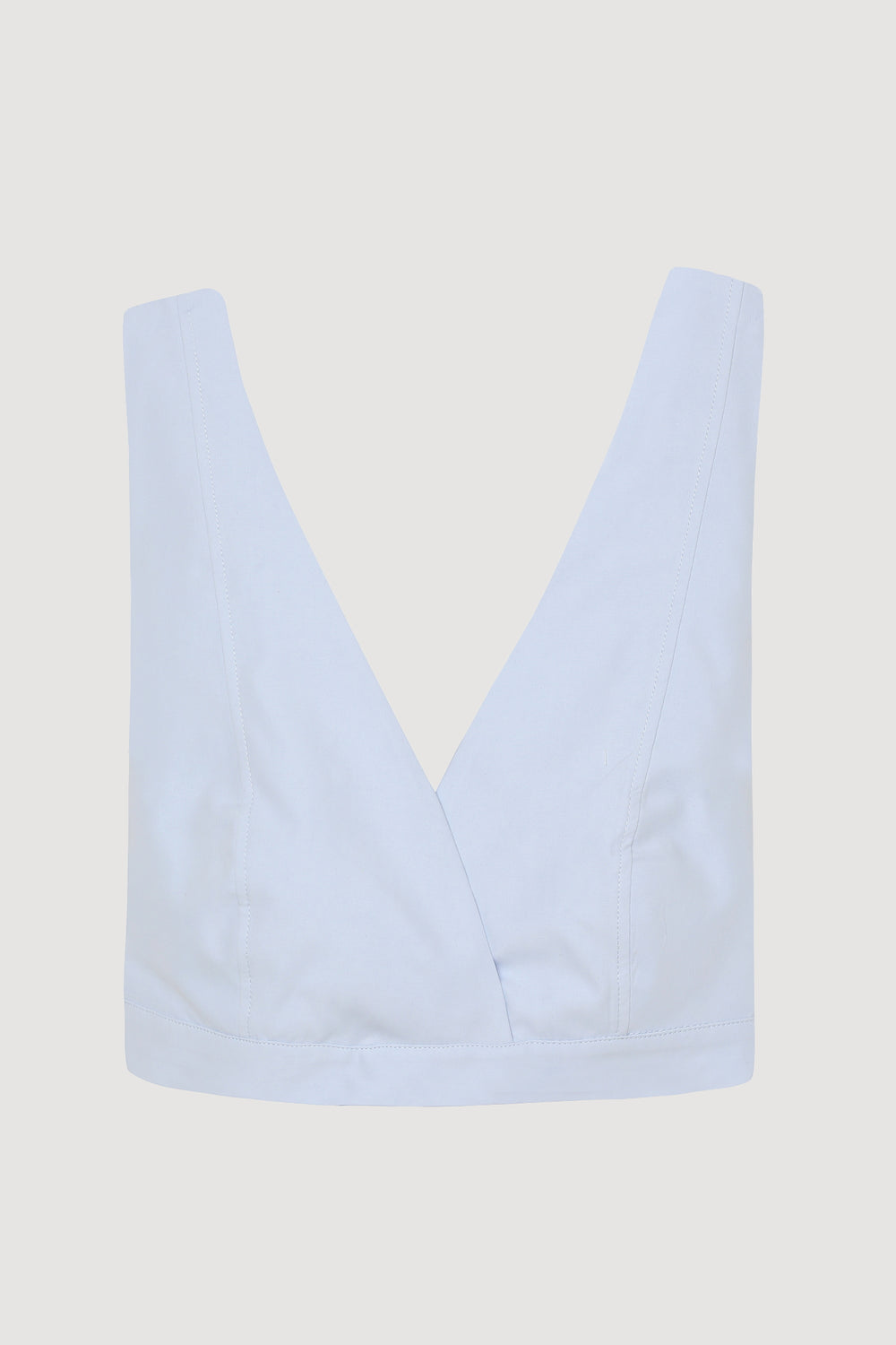 V yaka, kalın askılı bağlamalı, astarsız, önü kruvaze kesim detaylı, sırtı v yaka lastikli crop boy büstiyer bluz.
