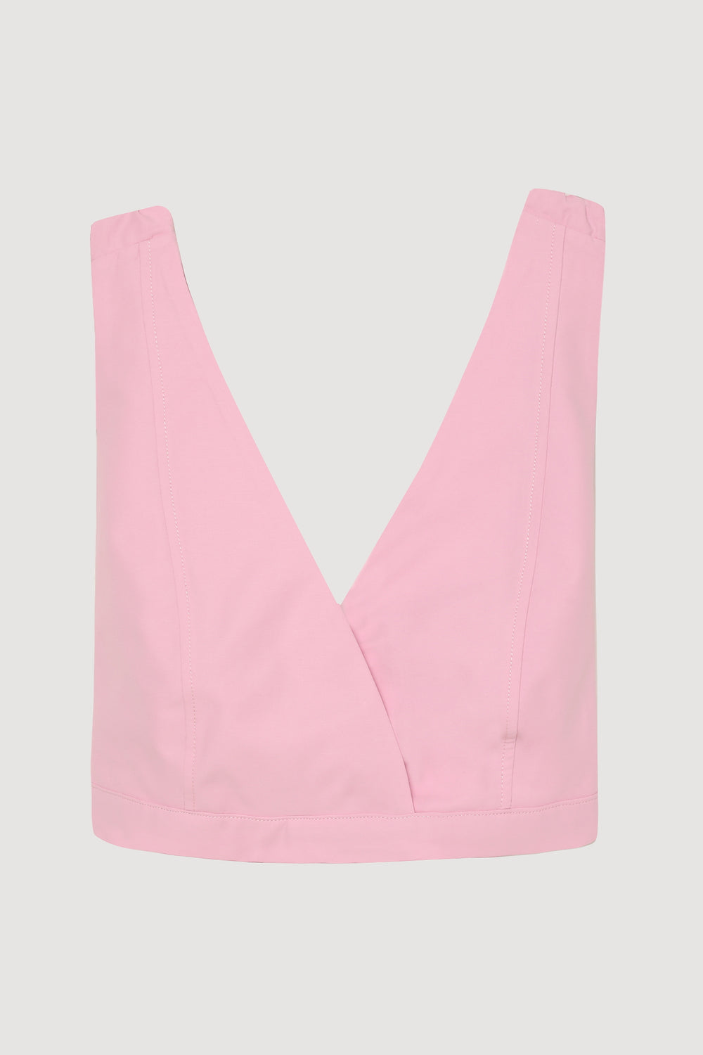 V yaka, kalın askılı bağlamalı, astarsız, önü kruvaze kesim detaylı, sırtı v yaka lastikli crop boy büstiyer bluz.