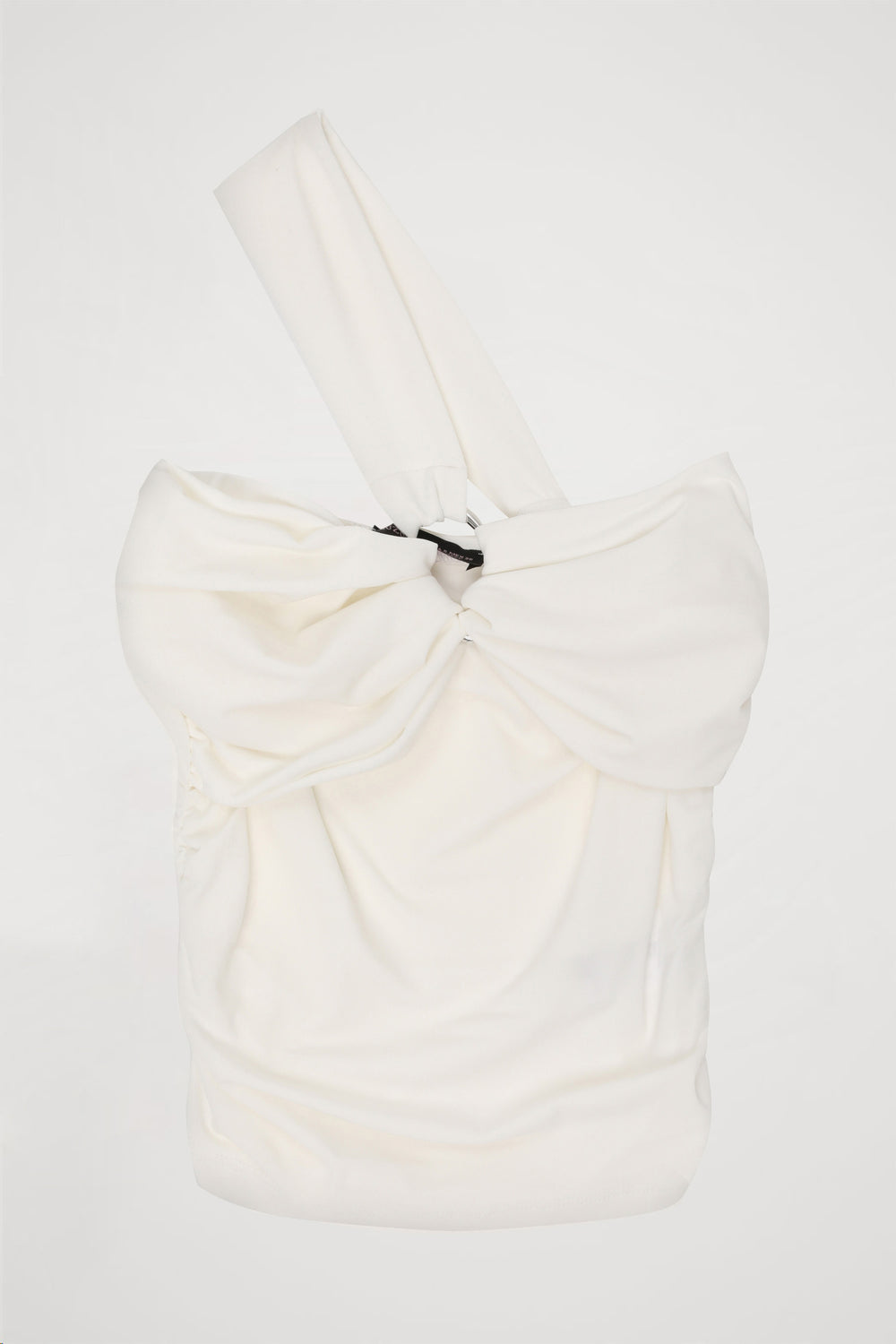 Tek omuzlu, toka halka aksesuar detaylı, drape tasarımlı, sırtı lastik detaylı, modern ve zarif ve şık straplez bluz.