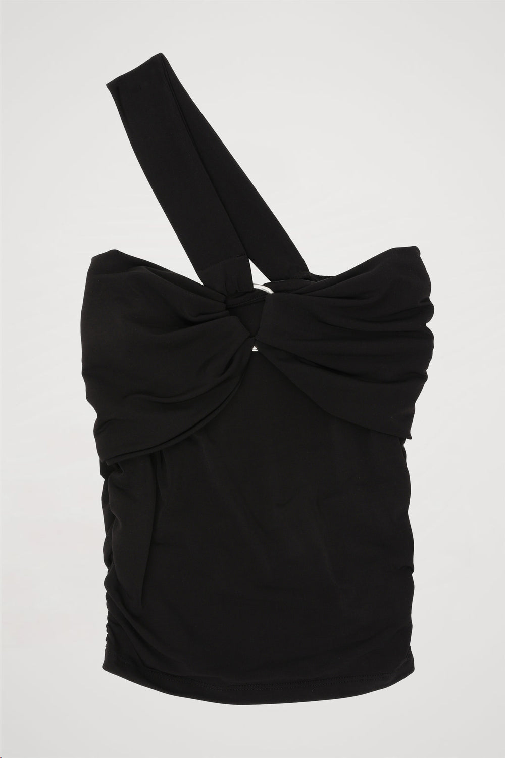 Tek omuzlu, toka halka aksesuar detaylı, drape tasarımlı, sırtı lastik detaylı, modern ve zarif ve şık straplez bluz.