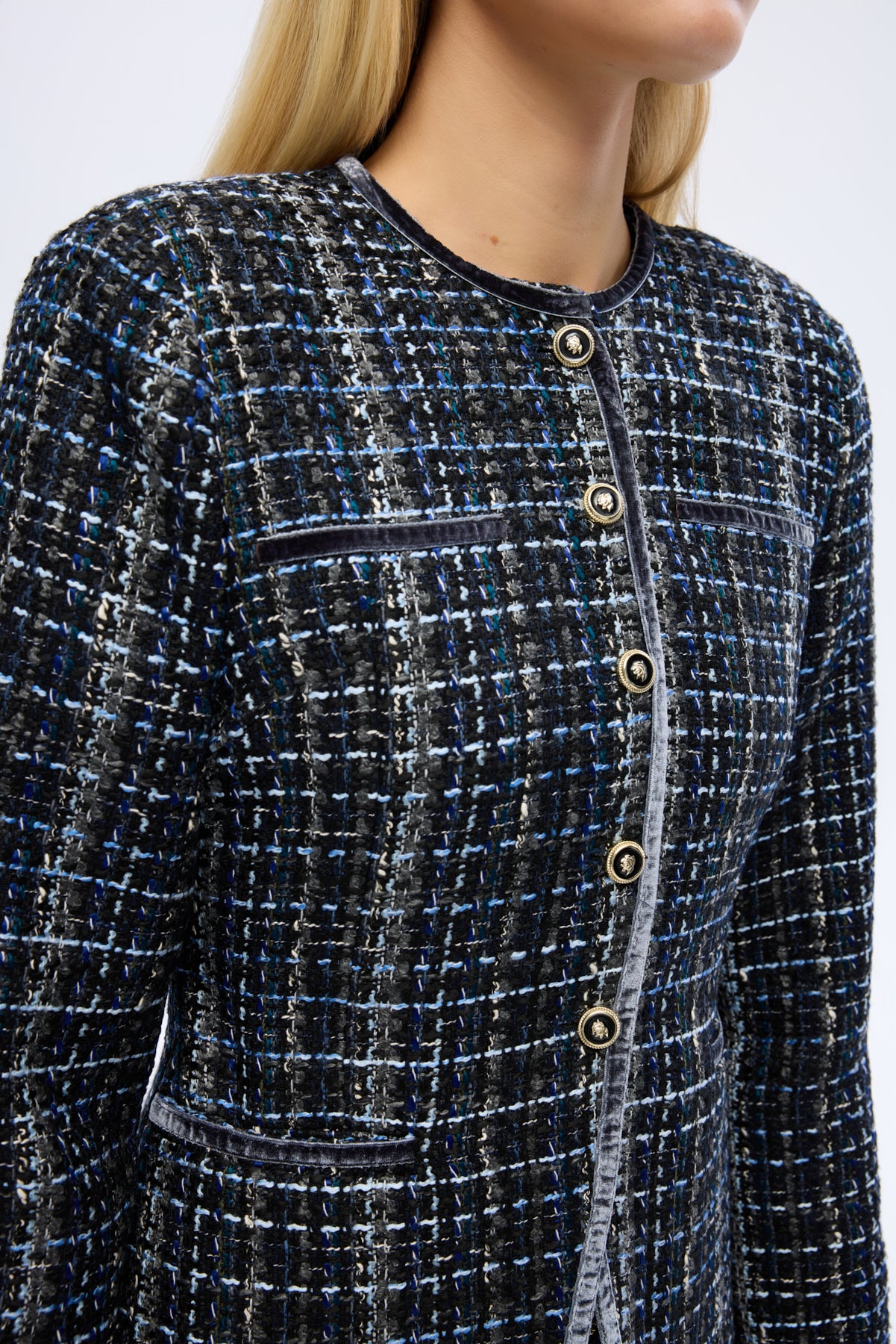 İçi astarlı, yuvarlak yakalı, uzun kollu, cepli, gold düğme kapamalı, parlak kadife kumaştan biyeli tüvit ceket.