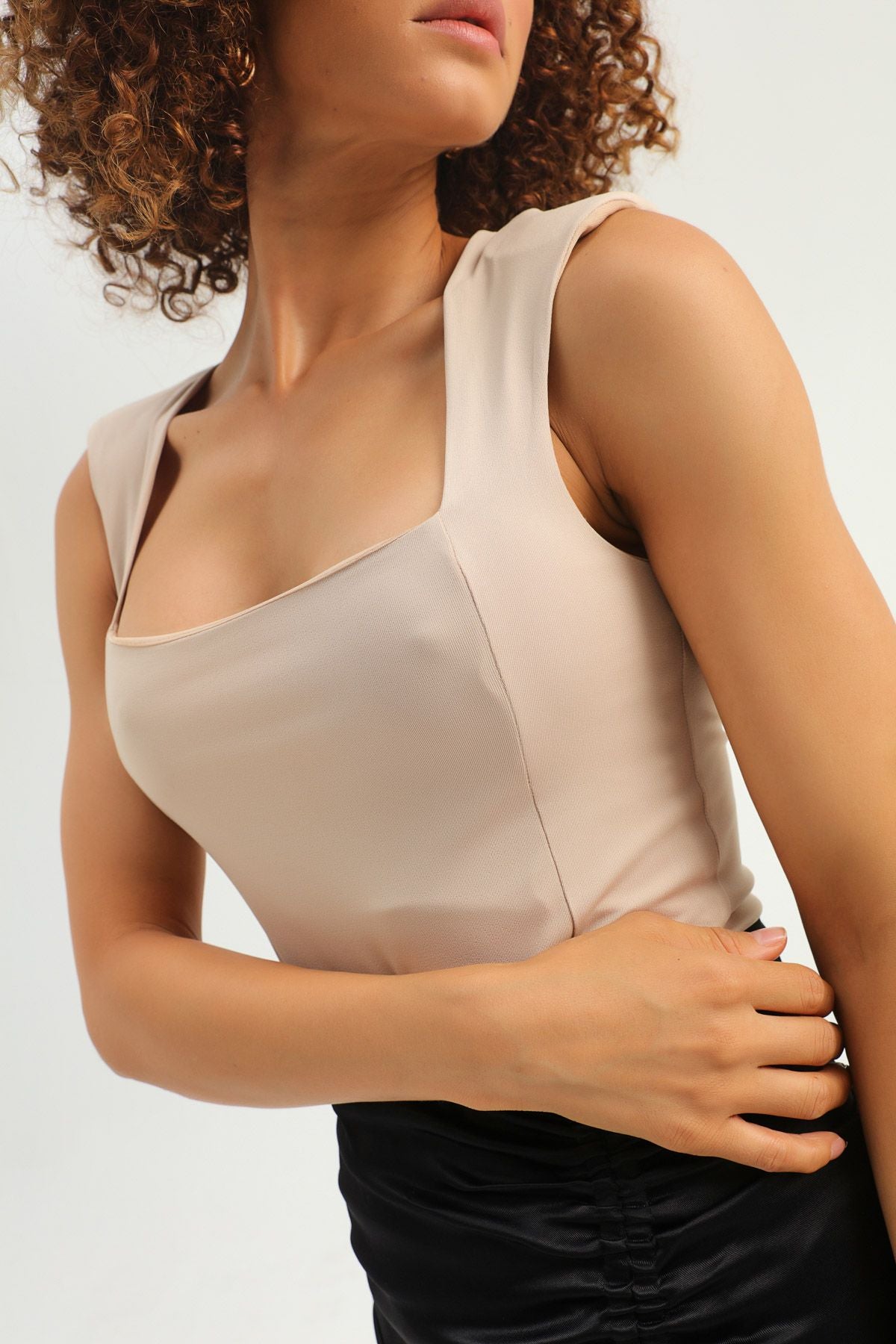 Vatkalı Kare Yaka Bodysuit Bej