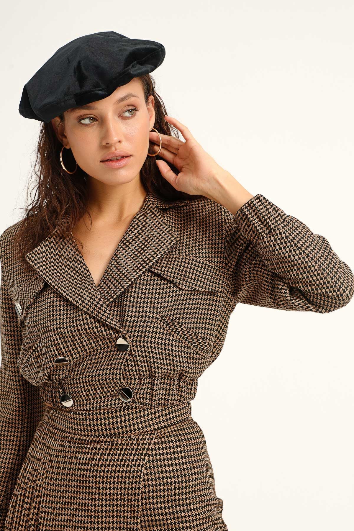 Nefes kesen bu ayrılmaz ikili, dolabının yeni favorisi olabilir. “Giy ve çık” kombininle hem iş toplantılarına hem de arkadaş buluşmalarına, bu setle eşlik ederek farkını ortaya koy! Kaz ayağı desenli kruvaze crop ceket modeli her cephede tek başına savaşacak kadar feminen ve güçlü!