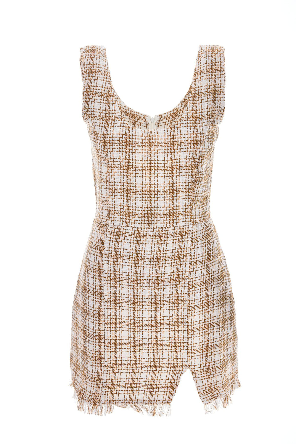 Karpuz Kol V Yaka Çizgili Elbise Bej