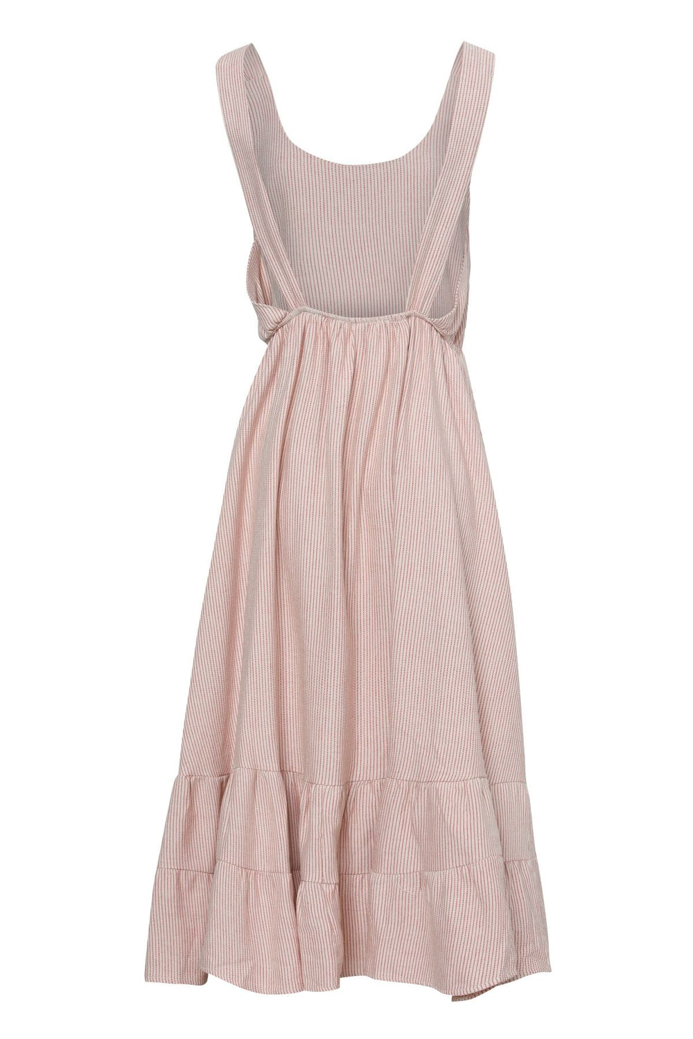Çizgili Kemerli Balon Kol Elbise Pudra
