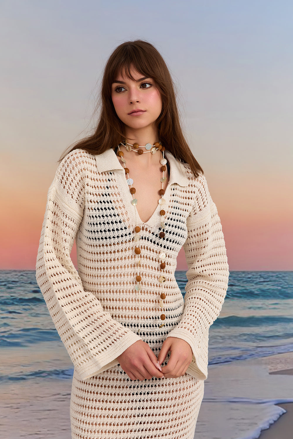 Derin V yaka dekolteli, uzun kollu, ajur detaylı, triko elbise.