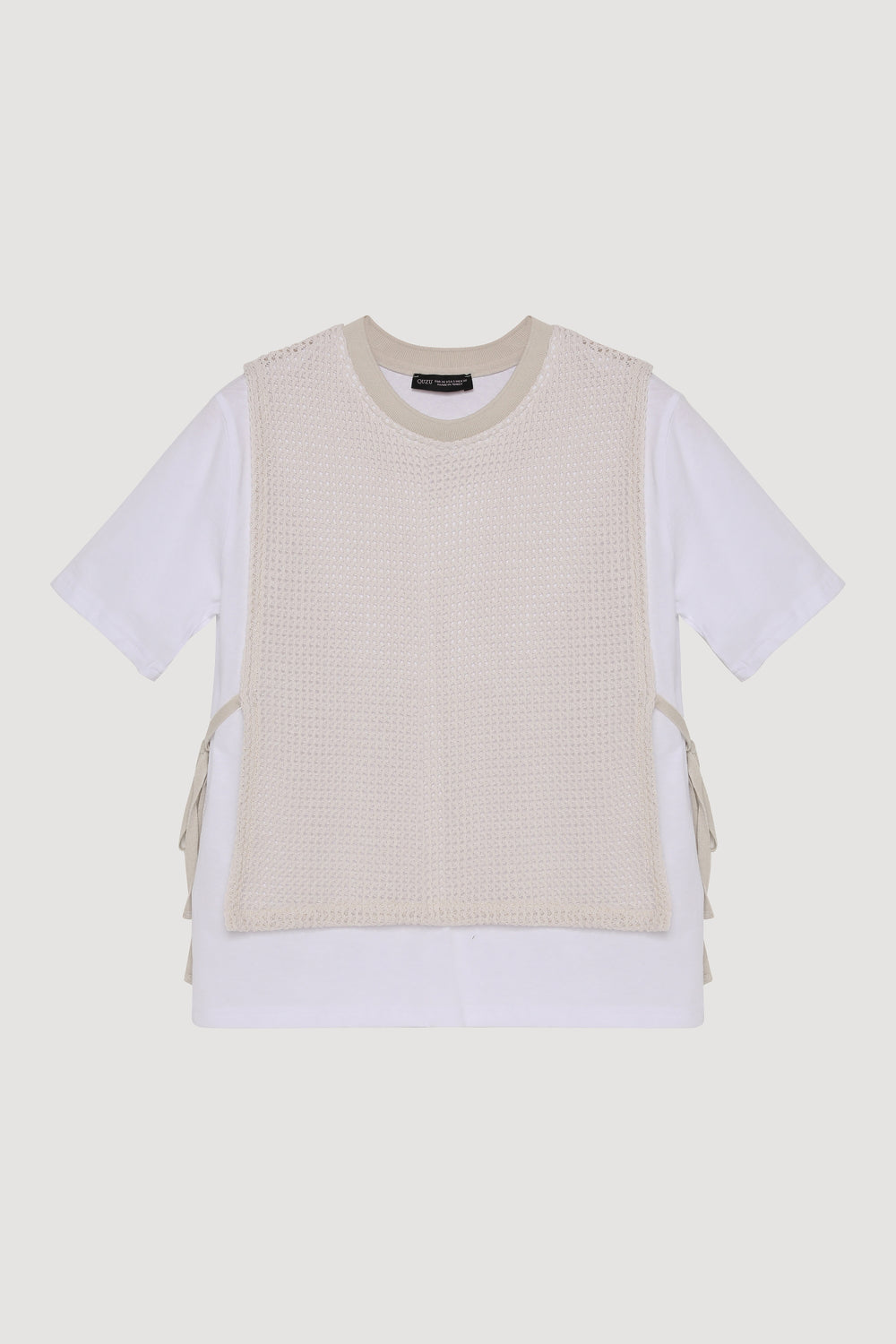 Yan bağcık detaylı, ajur dokulu, bisiklet yaka, kısa kollue, şık ve modern görünümlü, rahat kalıp, triko yelekli tişört.