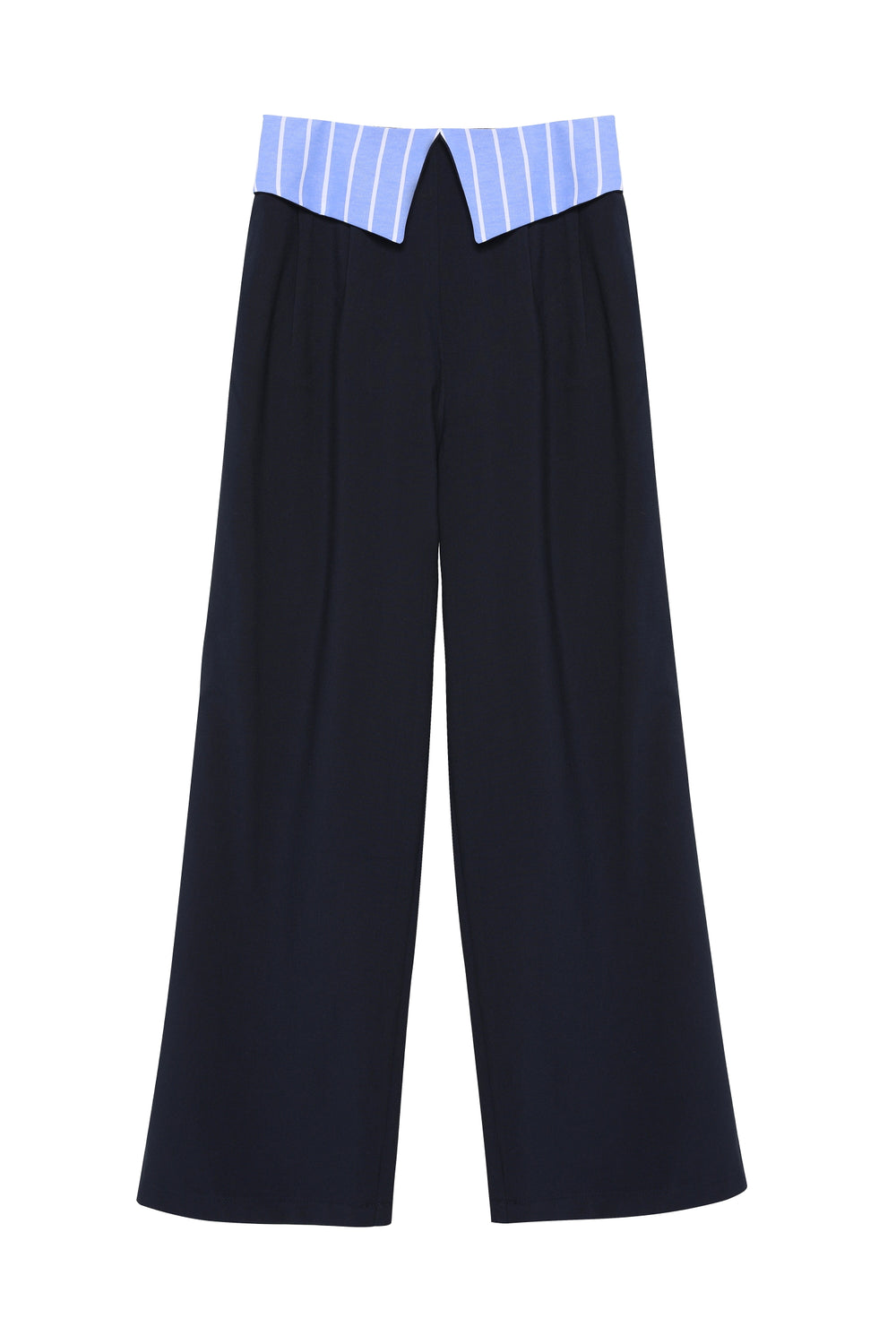 Bel Detaylı Bol Paça Kumaş Pantolon Lacivert