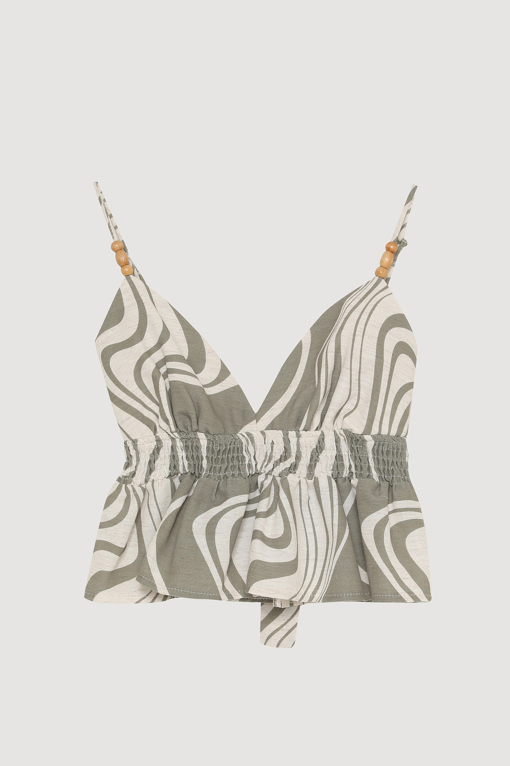 Boncuk Askılı Gipeli Crop Keten Bluz Haki