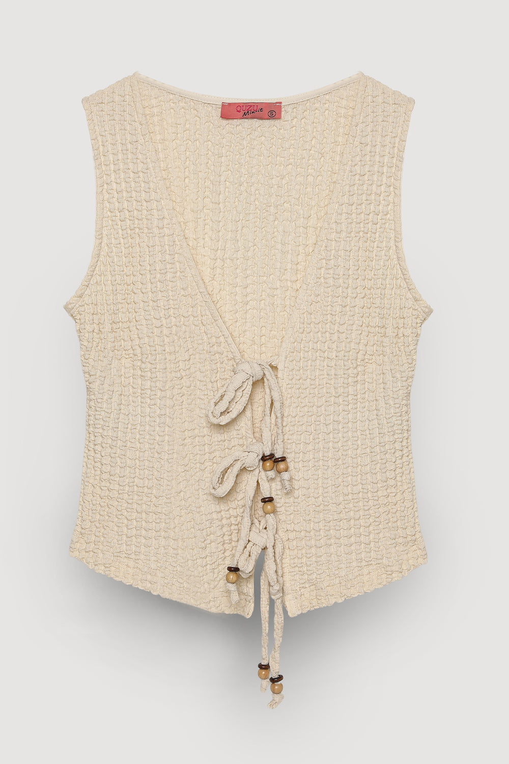 V yaka, dokulu gofre kumaş, astarsız, önden ip bağlamalı, boncuk detaylı, kolsuz, modern görünümlü crop boy bluz.