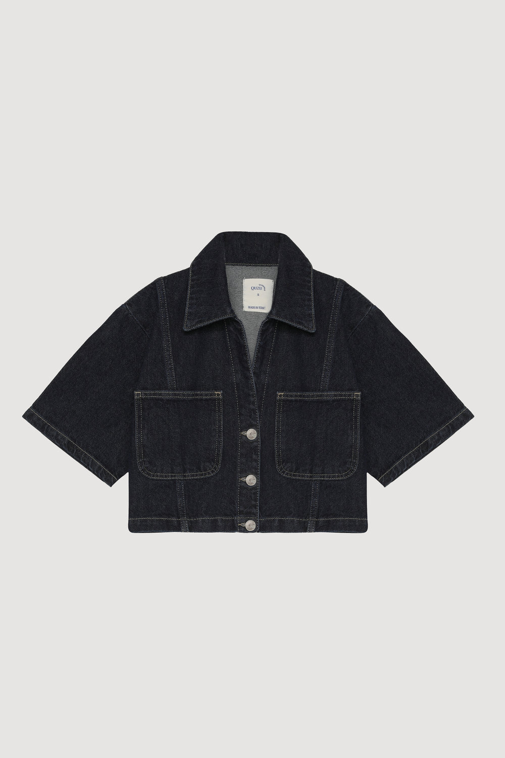 Düğme kapamalı, kısa kollu, büyük cepli, crop boy, astarsız, modern görünüm sunan gömlek formunda kot ceket.
