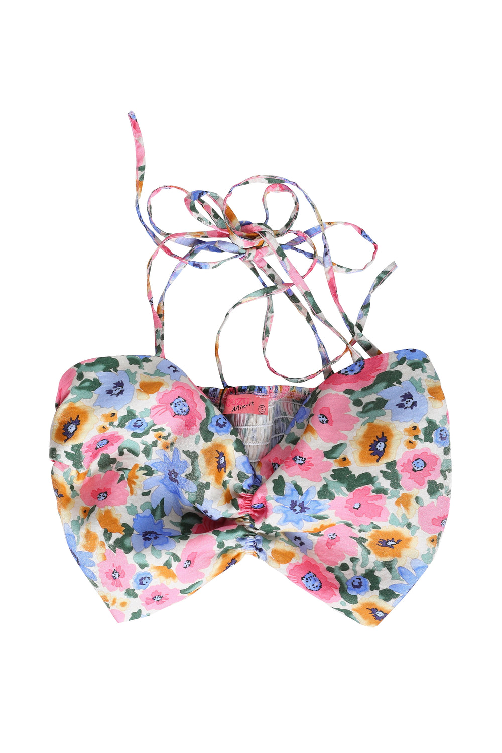 Çiçek desenli, ince askılı, büzgü detaylı, crop bluz.