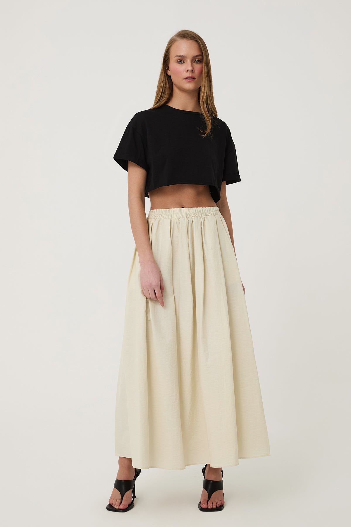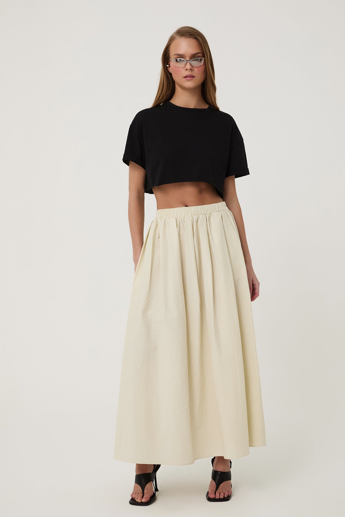 Midi boy, cepli, beli lastikli, volümlü etek.