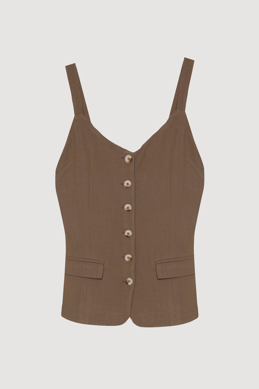 Kalın askılı, v yaka, önü renkli düğme kapamalı, cep kapak detaylı, vücuda oturan formda, crop boy keten bluz.