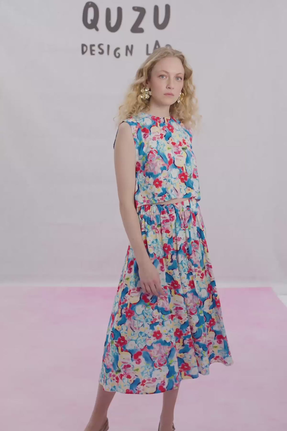 Lastikli beliyle konfor sunan, rengarenk çiçek desenli, bol kesim, beli pileli, modern görünümlü midi boy etek.