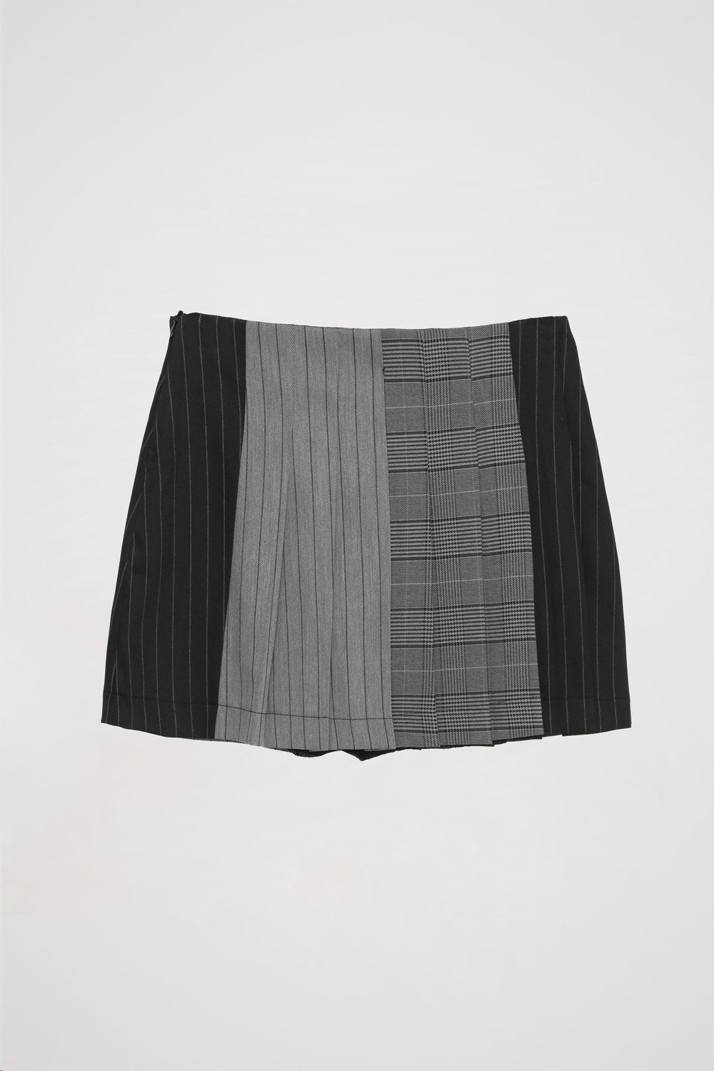 Çizgi matchli ve pileli detaylara sahip, yüksek bel, içi şort astarlı, yandan fermuarlı, zarif ve şık mini etek.