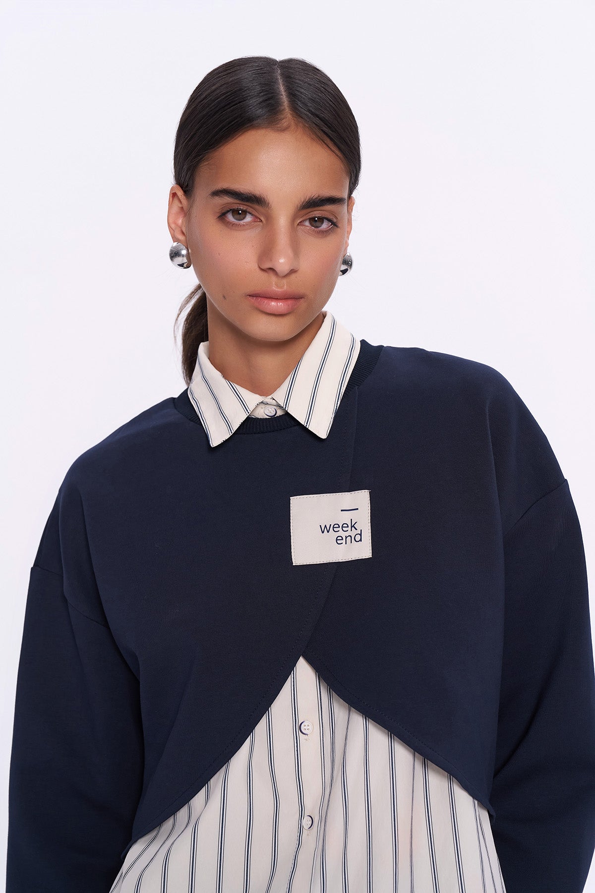 Çizgili Gömlek Match Crop Sweatshirt Lacivert