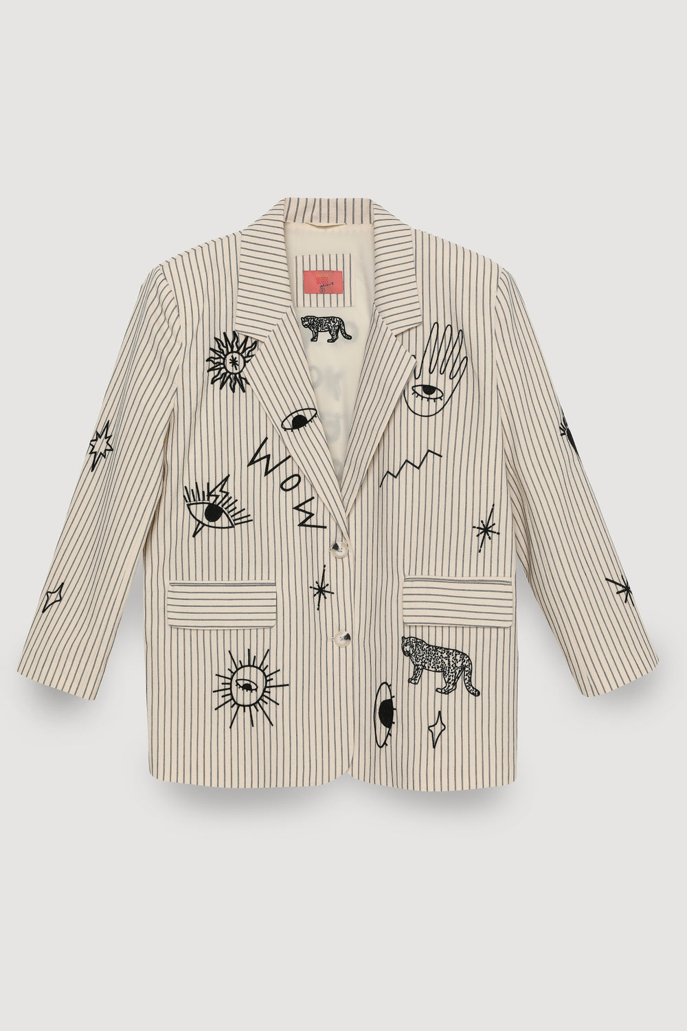 İnce çizgili desen üzerine nakış detaylı, içi astarlı nakış detaylı, uzun kollu, düğme kapamalı, cepli, oversize blazer ceket.