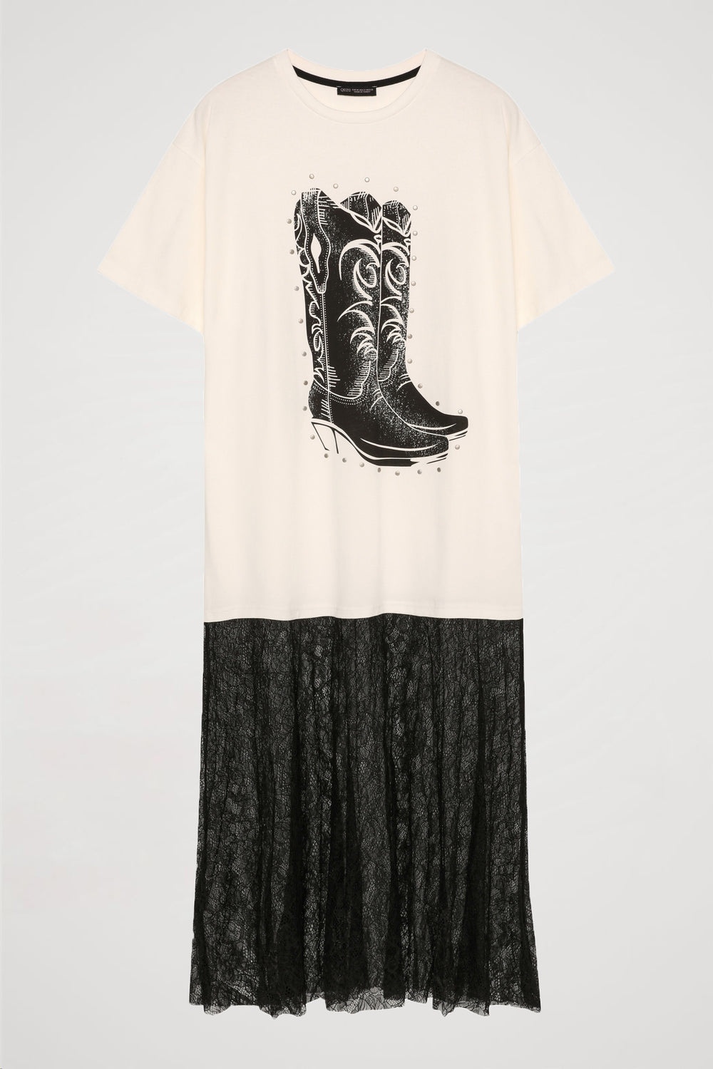 Bisiklet yaka, kısa kollu, ön yüzünde kovboy baskılı ve metal detaylarla hareketlendirilmiş, alt kısmı dantel kumaş detaylı, tişört elbise.