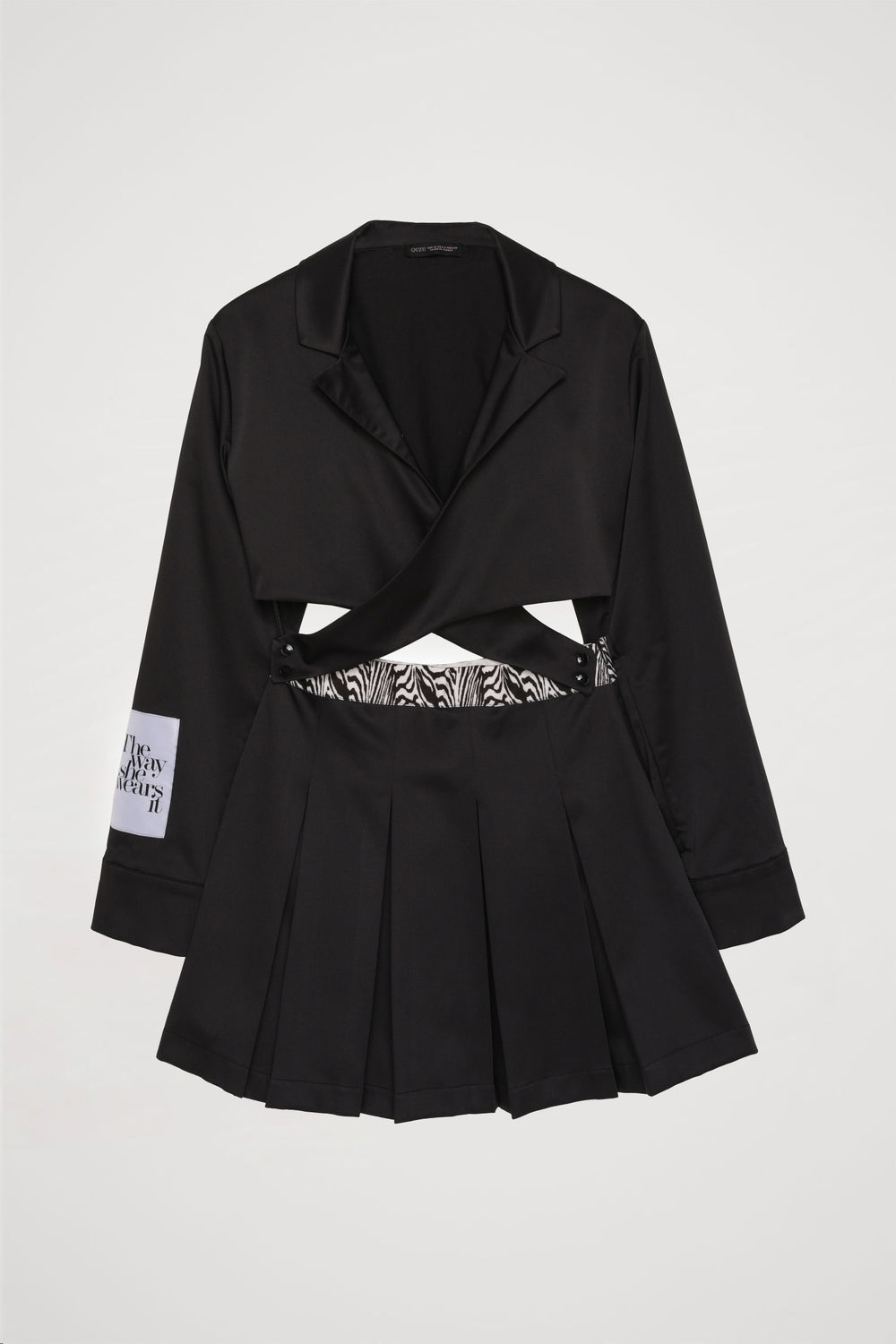 Kruvaze yakalı, beli zebra desen lastikli, uzun kollu, cut out detaylı, kolu "the way she wears it" yazı etiket baskılı, çıkarılabilir düğmeli üstü, yandan fermuar kapamalı, pileli saten mini elbise.