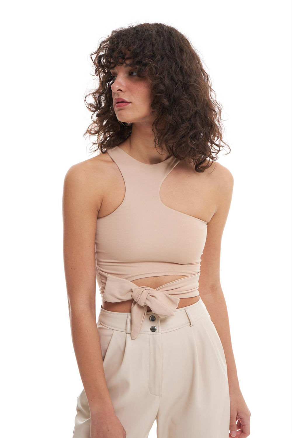 Boyundan geçmeli asimetrik kesim askılı crop bluz, bel kısmındaki kemer ip detayı ile isteğe göre bağlanabilir.