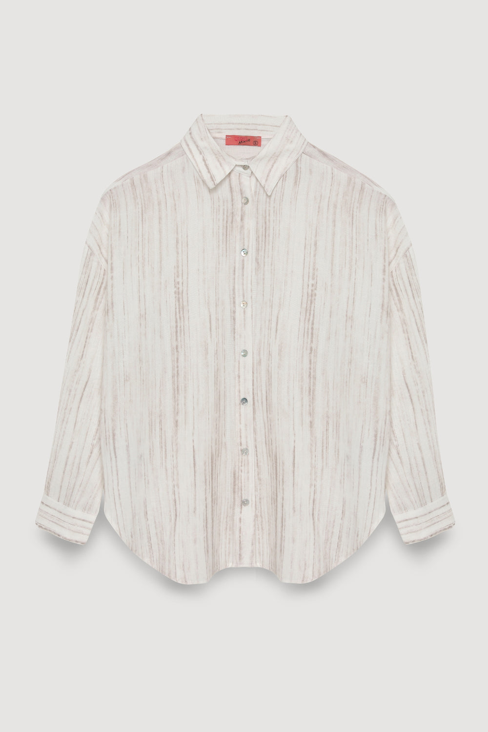 Dokulu kumaş detaylı, klasik gömlek yaka, uzun kollu, önü düğmeli, modern ve zarif görünümlü oversize kesim gömlek.