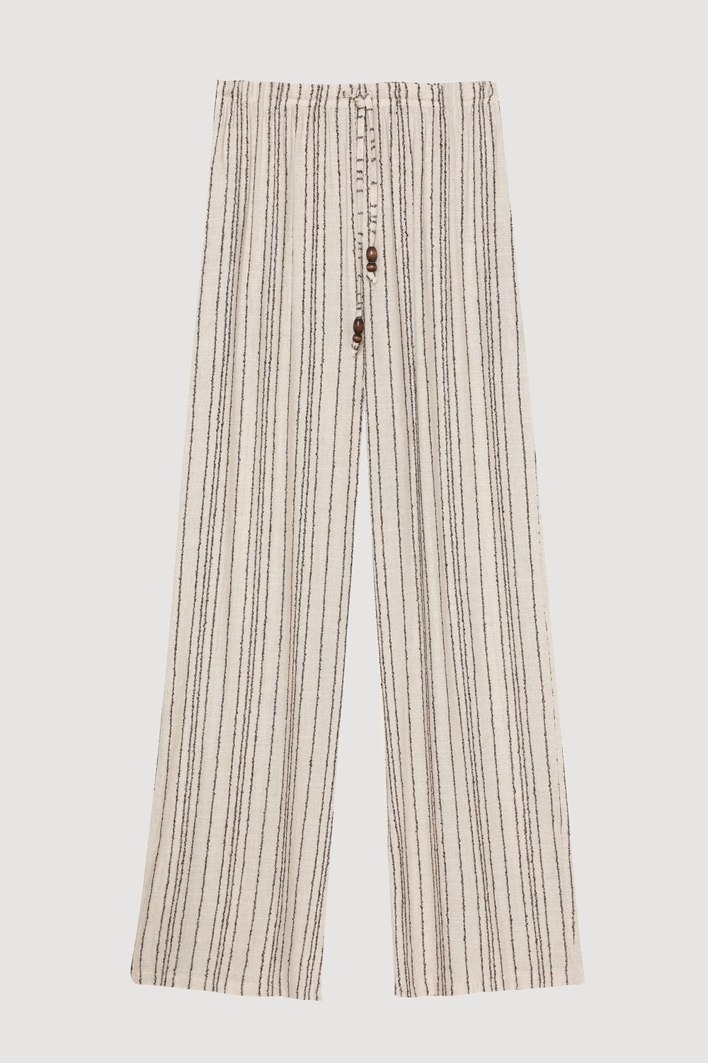 Yüksek bel, beli lastikli bağcık bağlamalı boncuk detaylı, düz paça, dokulu ince çizgili kumaştan, çift cepli, rahat kesim keten pantolon.
