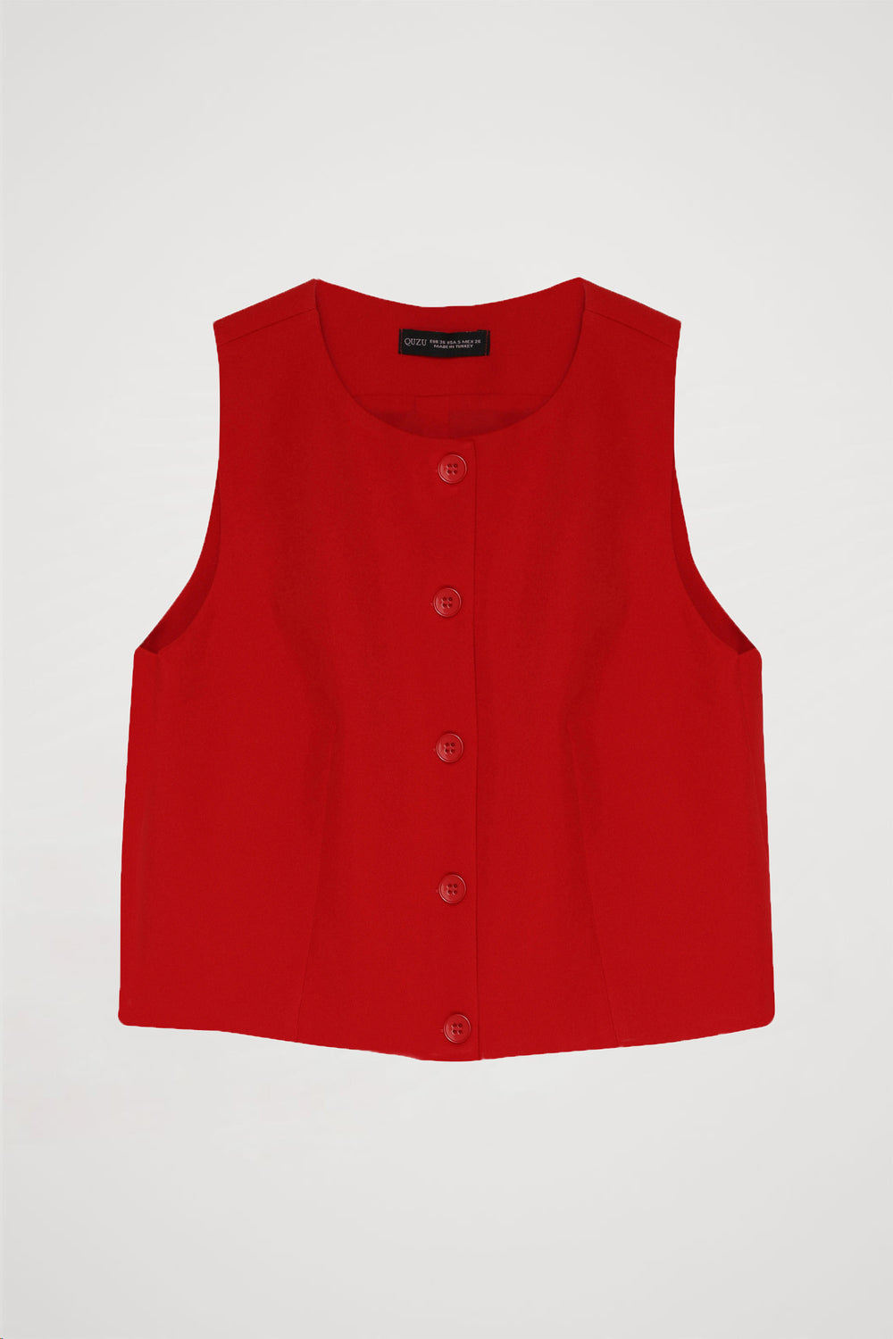 İçi astarlı, kolsuz, düğme kapamalı, yuvarlak yakalı, kısa boy, zarif ve modern tasarımlı şık yelek ceket.