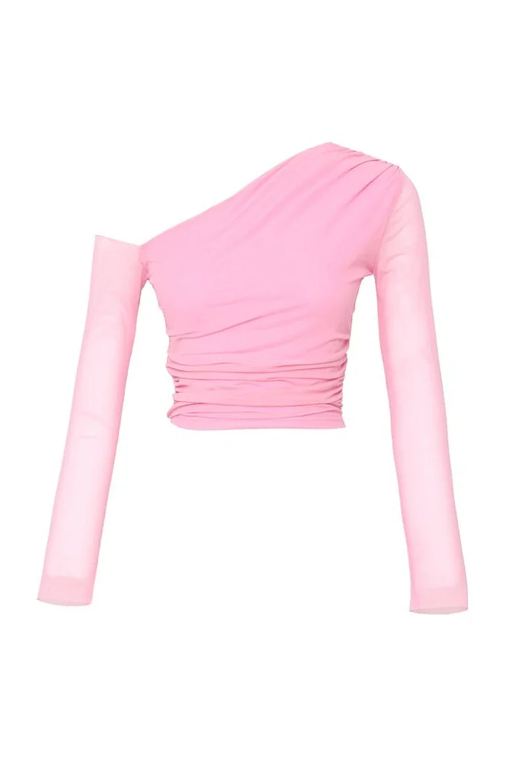 Düşük Omuz Detaylı Tül Bluz Pembe