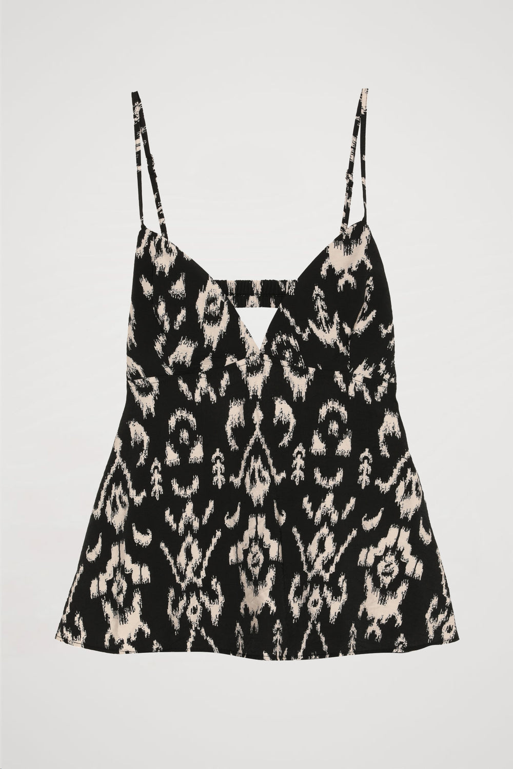 Etnik desenli, v yaka, sırtı lastik dekolte detaylı, askılı bluz.