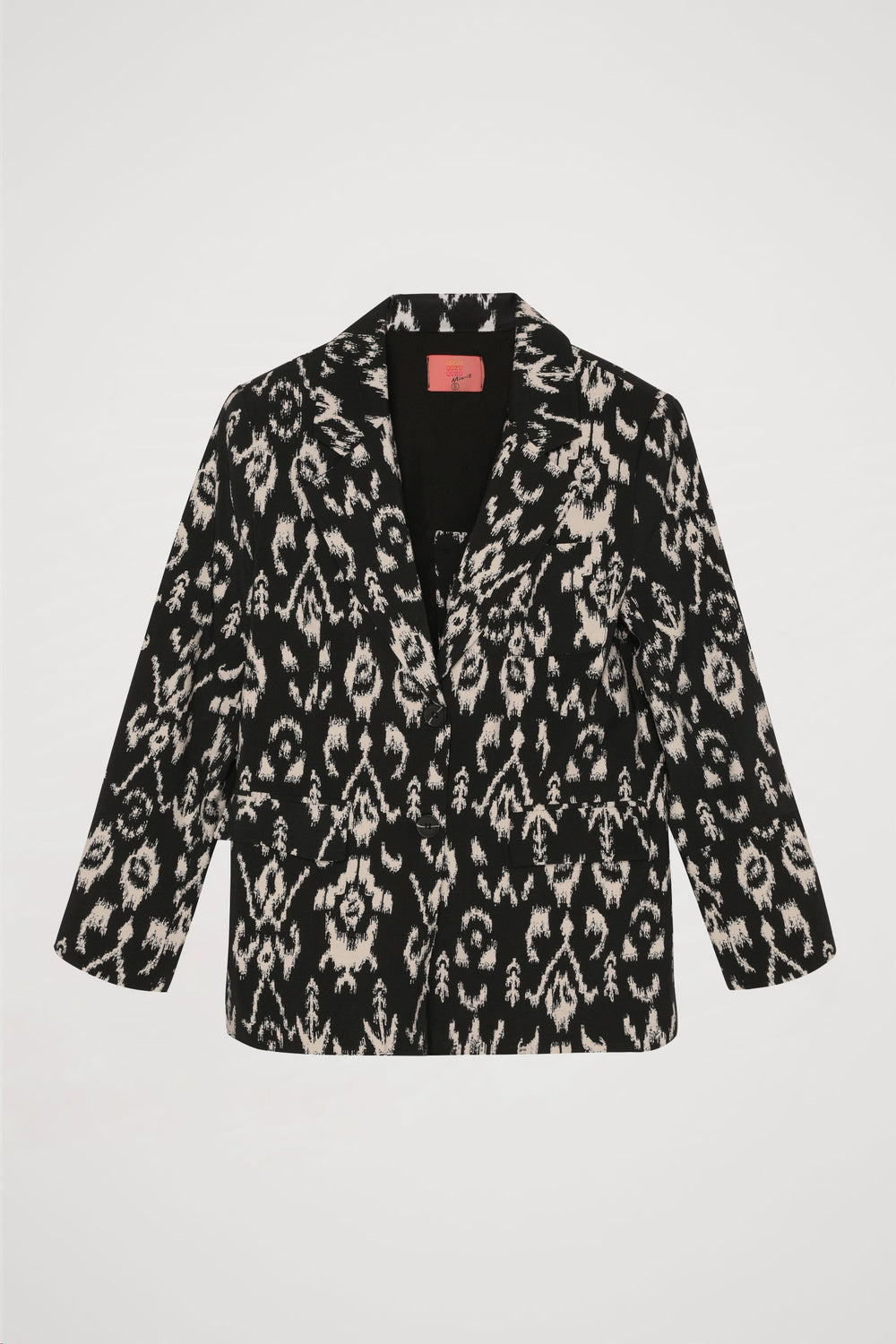 Etnik desenli, içi astarlı, düğme kapamalı, kruvaze yaka, uzun kol, çift cep kapaklı, sırtı düğme detaylı blazer ceket.