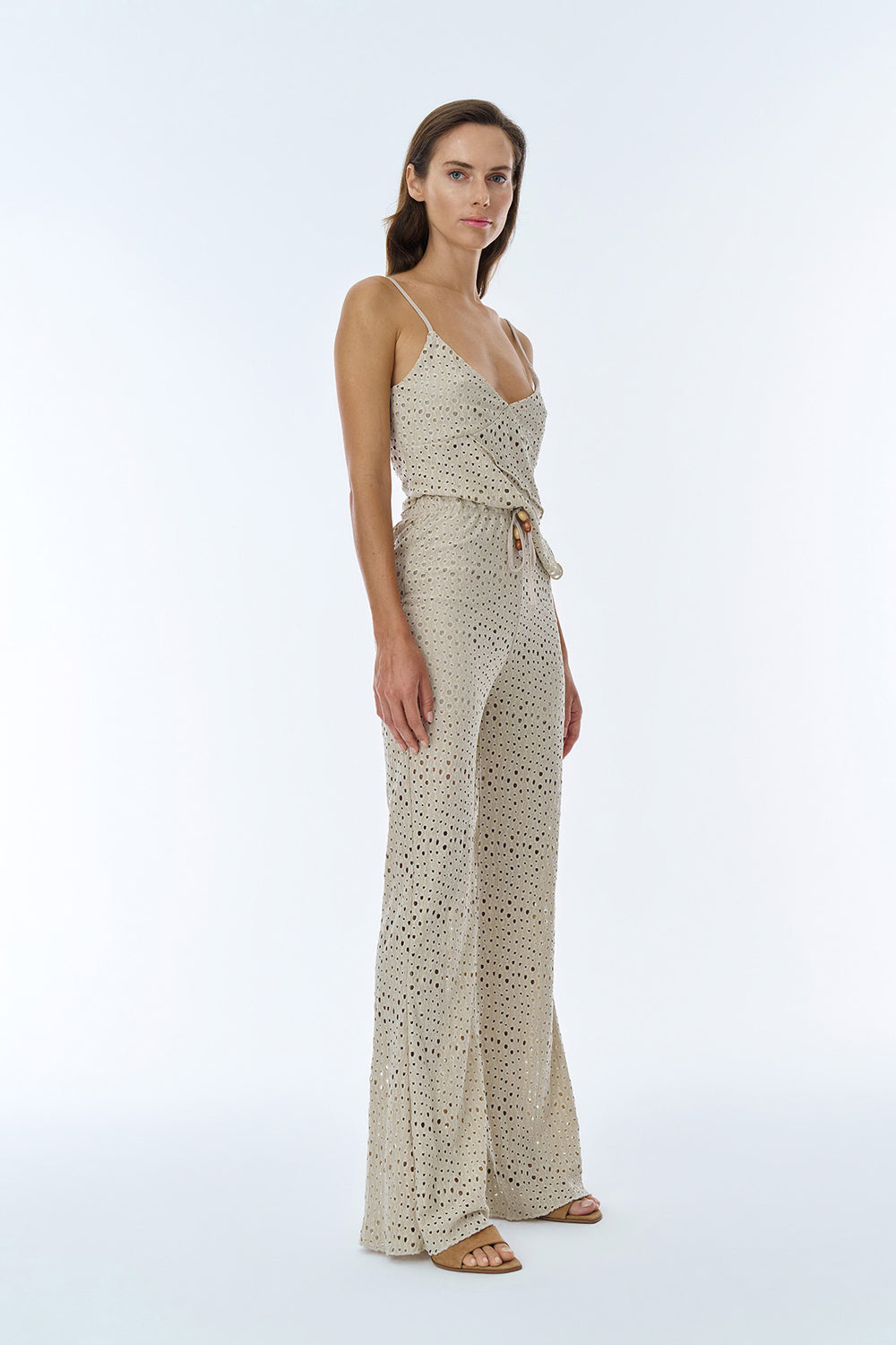 Yüksek bel, geniş paçalı, fisto detaylı pantolon.
