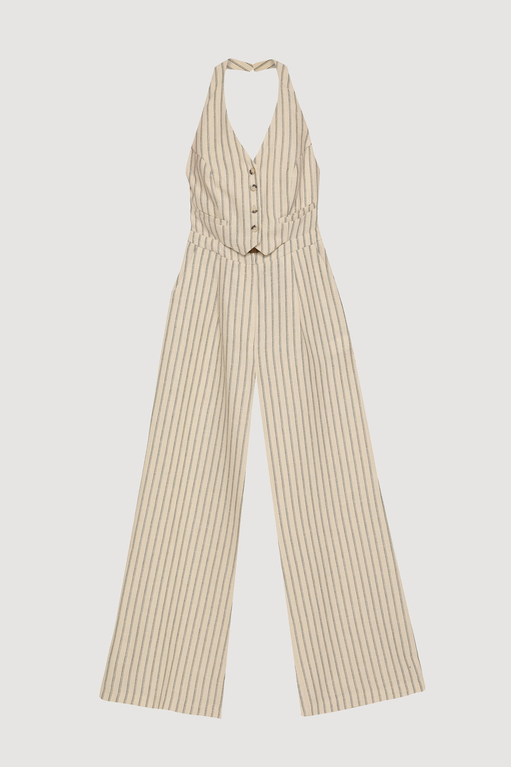 Çizgili desenli, halter yaka boyundan düğme kapamalı, ön düğme ve fermuar kanca kapamalı, cepli, beli oturan formda, geniş paça, astarsız uzun tulum.