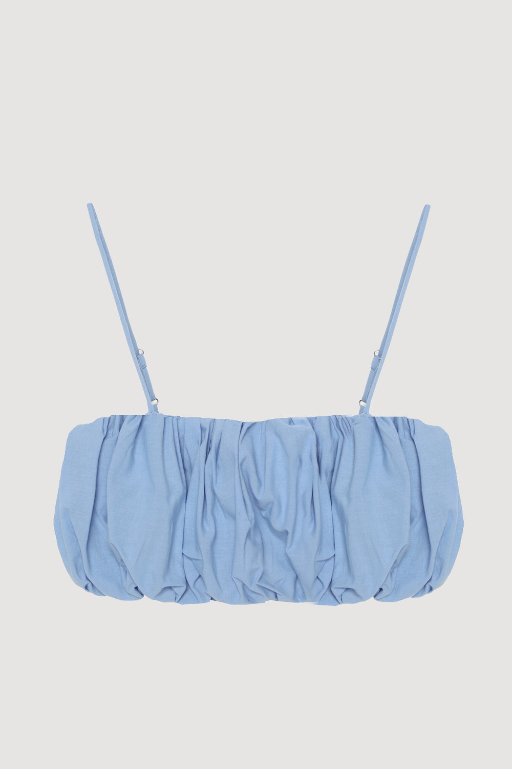 İçi çift kat kumaşlı, ayarlanabilir ince askılı, balon formda, büzgülü, modern görünüm sunan crop büstiyer bluz.