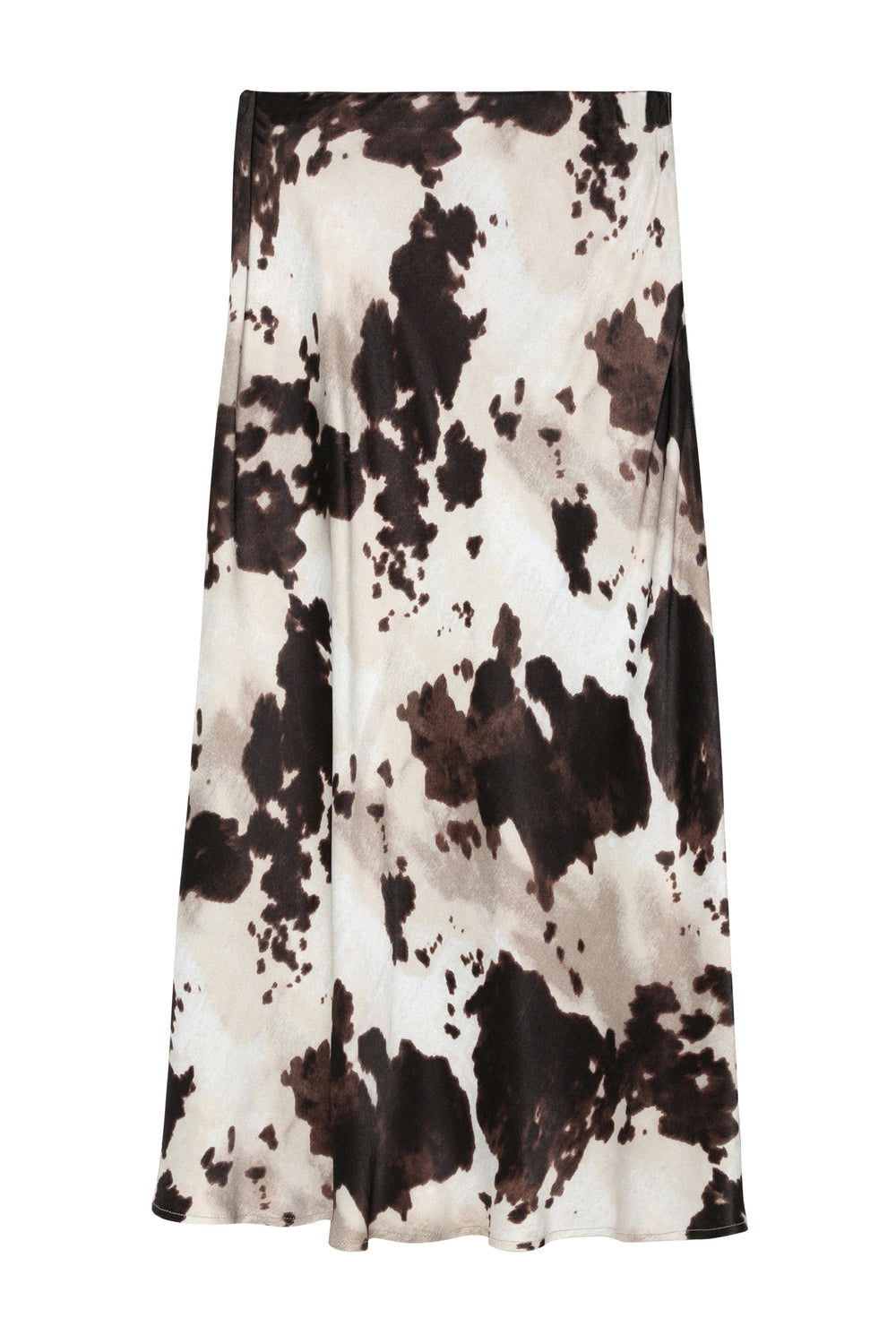 Yüksek bel, inek desenli, yandan fermuar kapamalı, saten midi etek.