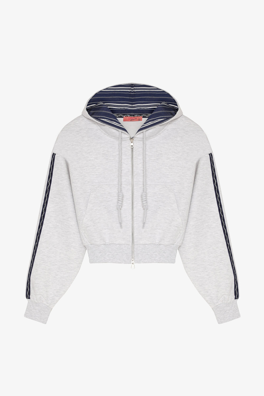Kapüşonlu içi çizgili kumaştan, kolları şerit detaylı, fermuar kapamalı, göğsü yazı nakış baskılı, şardonsuz, ip büzgü detaylı, kanguru cepli, uzun kollu, kısa boy sweatshirt.