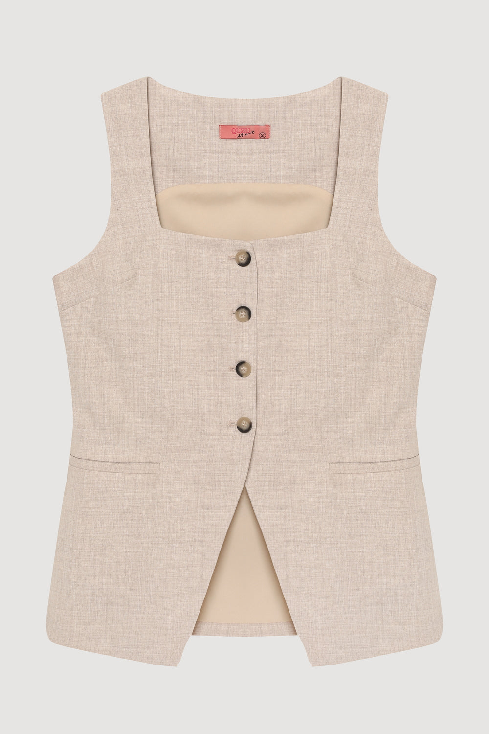 Kare Yaka Düğmeli Yelek Bluz Naturel