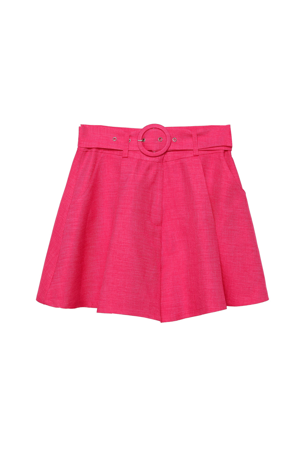 Beli kendinden kemerli, çift cepli, düz renkli, mini şort.