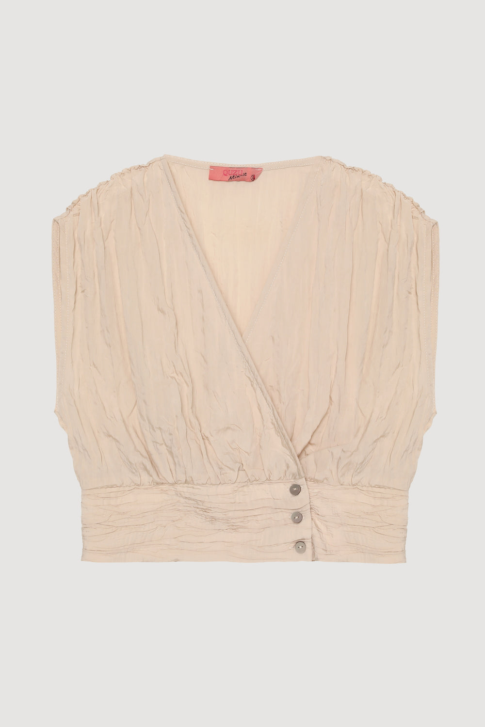 Kırışık dokuya sahip, içi astarsız, v yaka, kolsuz, kruvaze kesimli, belden yan kısmı düğme kapamalı crop bluz.